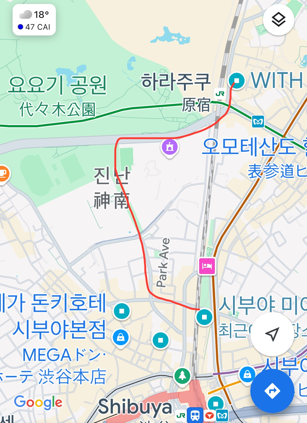 숲 속 분위기와 엄마의 옛이야기에 취해 한참 걷다 보니 길을 잘못 들어섰음을 알아차렸다. 육교를 건너는 게 아니라 그냥 직진했어야 했던 거였다. 잠시나마 요요기 공원 주위를 거닐어 봤다는 걸로 위안을 삼으며 벤치에 앉아 자판기 음료수를 빼 마셨다. 공원 안내판을 보는데 연세 드신 한국인 부부와 마주쳐 가벼운 인사를 나누며 메이지 신궁으로 가는 길도 안내해 드렸다.