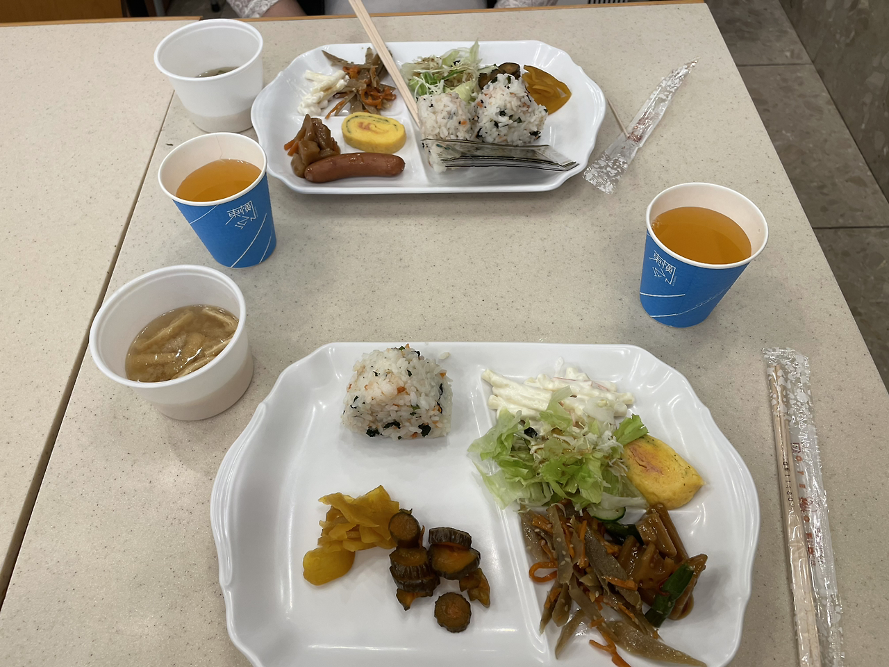 토요코인의 장점이라면 조식이 무료로 제공된다는 점이다. 지역과 지점마다 차이가 좀 있지만 고물가인 도쿄를 감안하면 삼각김밥에 국과 밑반찬, 샐러드가 차려진 미니 뷔페도 진수성찬이다.