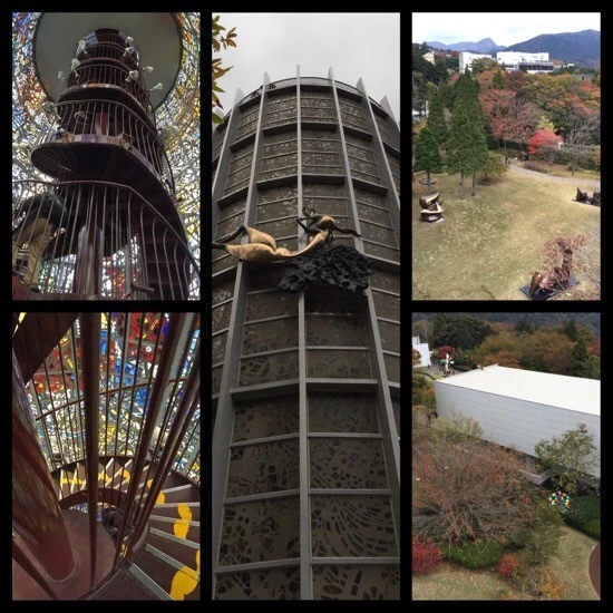 <행복을 부르는 심포니 조각>이라니 올라가지 않을 수 없었다. 18미터 되는 탑인데 빙빙 돌아가며 올라가려니 숨이 찼다. 헉헉 대며 올라서니 하코네 전경이 한눈에 보였다.