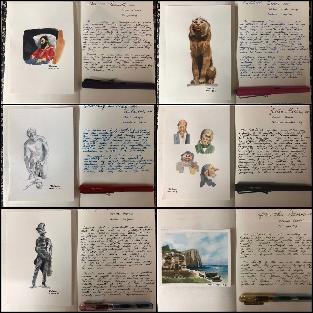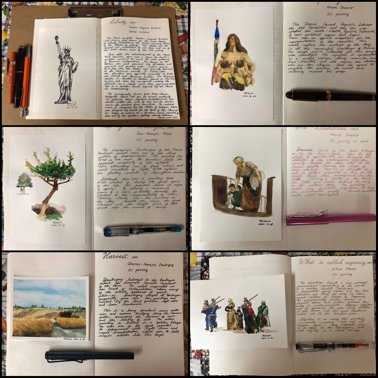 작년, 오르세 미술관을 처음 방문하곤 반나절밖에 머물지 못해 발길을 돌리며 다음에 갈 땐 마음에 드는 작품으로 내 스케치북을 채우리라며 아쉬운 마음을 다독였었다. 그런데 요즘 코로나 사태를 보아하니 오르세는커녕 유럽여행은 몇 년간 불가능할 듯싶다. 그러던 중 한동안 푹 빠져 하나둘 모아놨던 만년필과 잉크 관리가 걱정이 됐다. 그래서 시작한 게 오르세 오디오 가이드 앱의 설명글을 필사하며 명작을 따라 그려 보는 거였다.