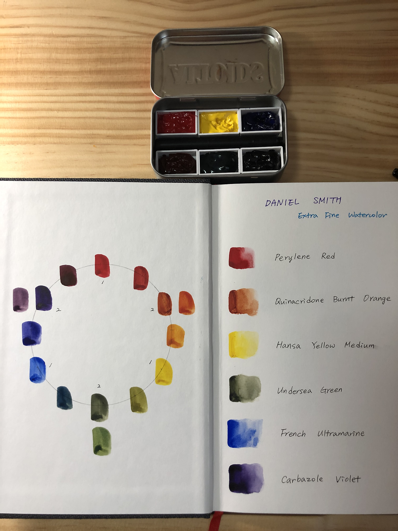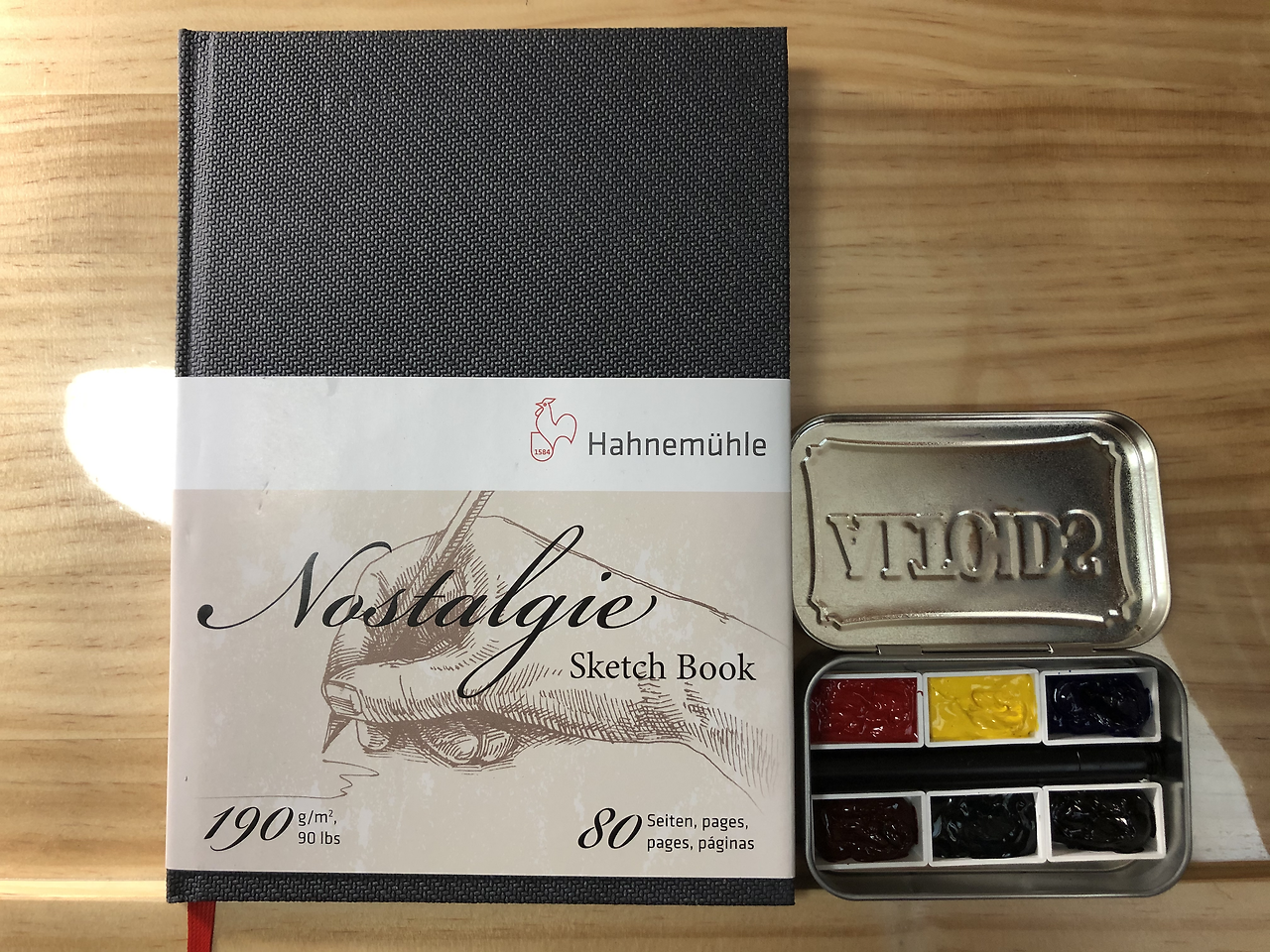 시작할 스케치북은 하네뮬레 양장 노트로 정했는데, 평방 무게가 190g이라서 가벼운 수채화가 가능하다. 물감은 비싸기로 소문난 다니엘 스미스로, 우선 1차색과 2차색만 구비했다. 수시로 꺼내 쓰려고 작은 알토이즈 캔디 통에 짜넣었다.