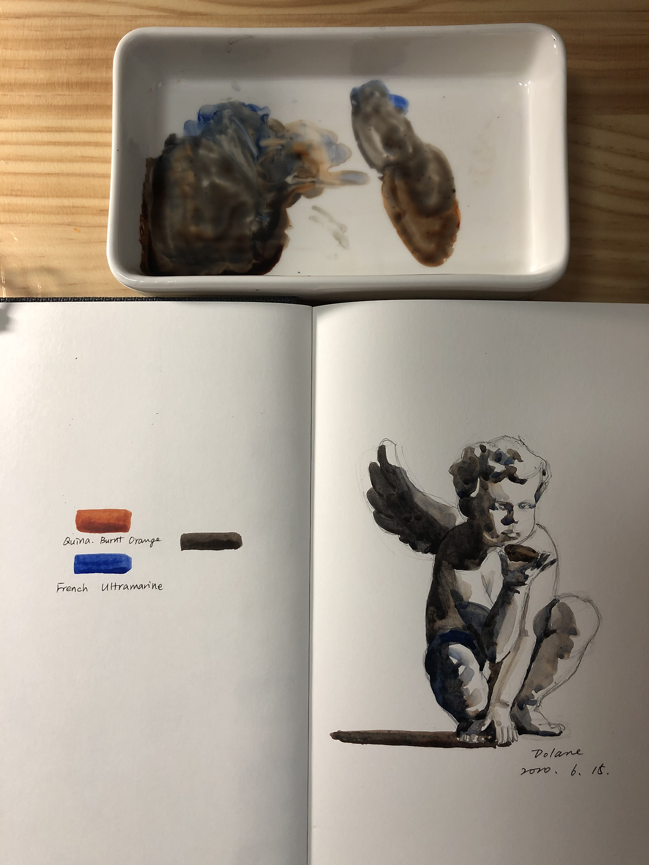 무채색의 조색은 1차색인 파란색(프렌치 울트라마린)과 2차색인 오렌지(퀴나크리돈 번트 오렌지)로 했는데, 색이 예쁘고 다양하게 나와 재미있었다. 수채화용 종이가 아니라서 번지기 표현이 덜 되지만, 드로잉을 중점으로 하기에 제격인 스케치북이다.