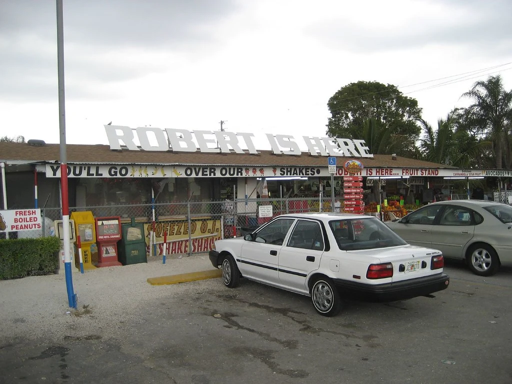 누구나 그렇겠지만, 여행하다 보면 자연스럽게 들르게 되는 특별한 장소들이 있다. 나에게는 이 과일가게가 그랬다. "Robert Is Here"는 플로리다 홈스테드에 있는 아주 특별한 과일가게이다. 이곳의 역사는 1959년으로 거슬러 올라가는데, 이 이름에는 귀여운 이야기가 깃들어 있다. 당시 7살이던 로버트 모엘링은 아버지와 함께 도로변에서 오이를 팔기 시작했다. 아버지는 로버트가 이곳에 있다는 것을 알리기 위해 "Robert Is Here"라는 간판을 세웠고, 그게 바로 이 가게의 시작이었다고 한다.