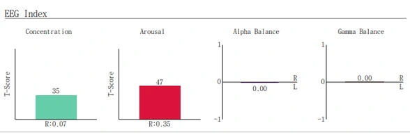 집중력 저하, 각성 수준 보통, 우울성향 없음, 좌/우뇌 균형 good!
