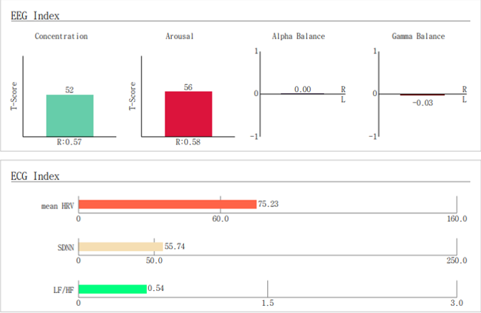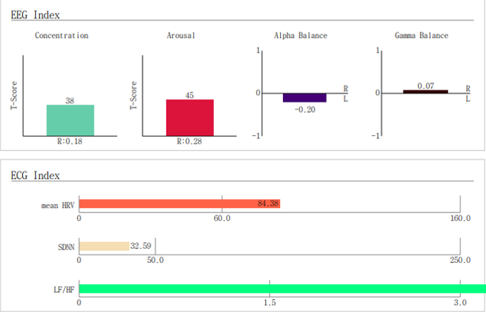 왼쪽부터 집중력, 각성, 알파밸런스(우울 수준), 감마밸런스(좌/우뇌 활성화비율), HRV(심박변이도), SDNN(스트레스저항도), LF/HF(단기스트레스)집중력은 저하되어 있고 각성 수준은 보통, 알파밸런스에서 -0.2로 다소 우울한 상태로 나왔다