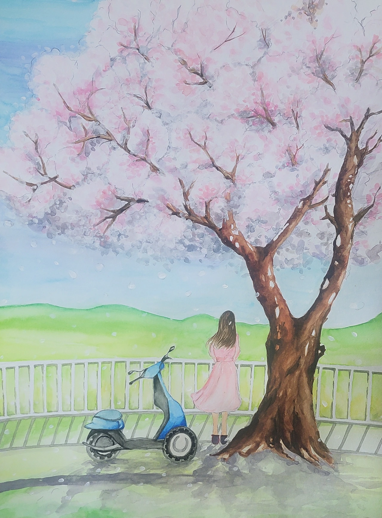 < 첫 수채화 > 내담자 3 : 벚꽃을 보려면 고개를 들어 여기를 봐야 되는데 저 먼 곳을 바라보고 있네요. 꽃이 예쁜데 어디를 보고 있는 걸까요?