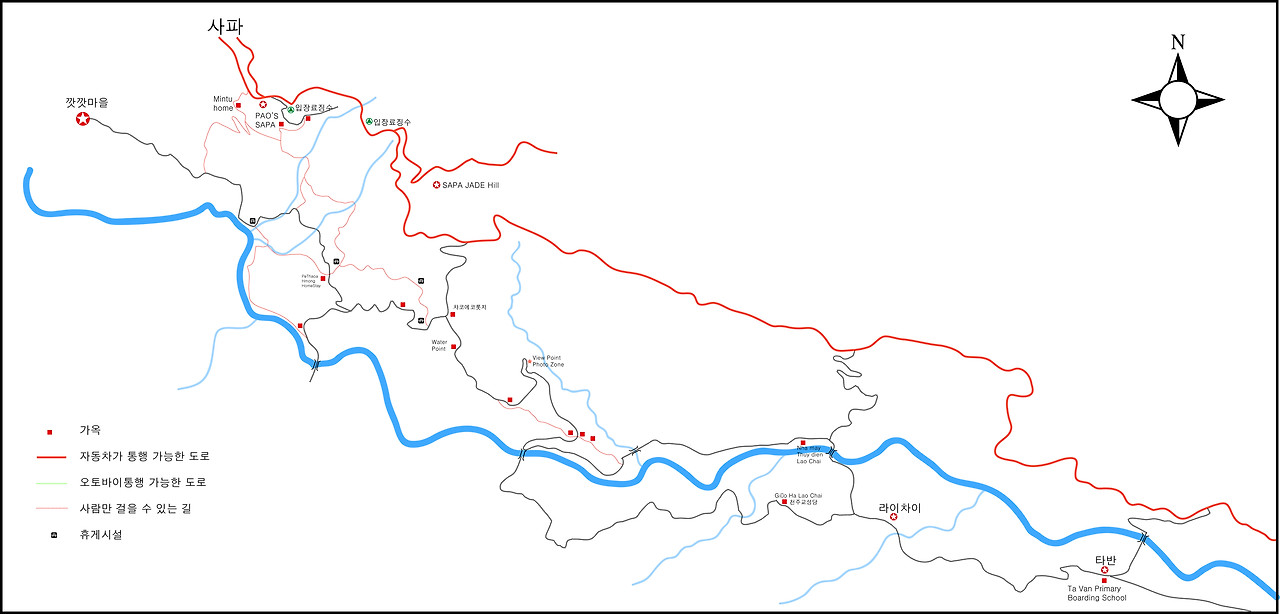 PAO'S SAPA Leisure는 큰길은 삼거리이다. 사파 광장으로 가는 길과 깟깟마을로 가는 길, 그리고 라이차이나 타반으로 가는 큰길로 구분된다. 전체적으로 사파 광장에서부터 내리막길을 내려오면서, 시야가 탁 트이는 시점이다. 라이차이로 가는 큰 길도 내리막길이며, 큰 길에서 오른쪽으로 보면 작은 시멘트 길이 나온다. 차는 다니기가 어려우나, 오토바이는 다닐 수 있는 길이며, 그 길 따라가면 길가에서 입장료를 받는 사람이 있다. 입장료 75,000VND을 지불하면 작은 표를 한 장 준다. 이곳을 지나면 오른쪽 아래로 휘어지면서 내려간다. 길을 돌아 내려가면 집이 한채 나오고 아래로 급경사 좁은 오솔길이 나오는데, 그 길이 현지 가이드들이 내려가는 논두렁길이라고 보면 된다.