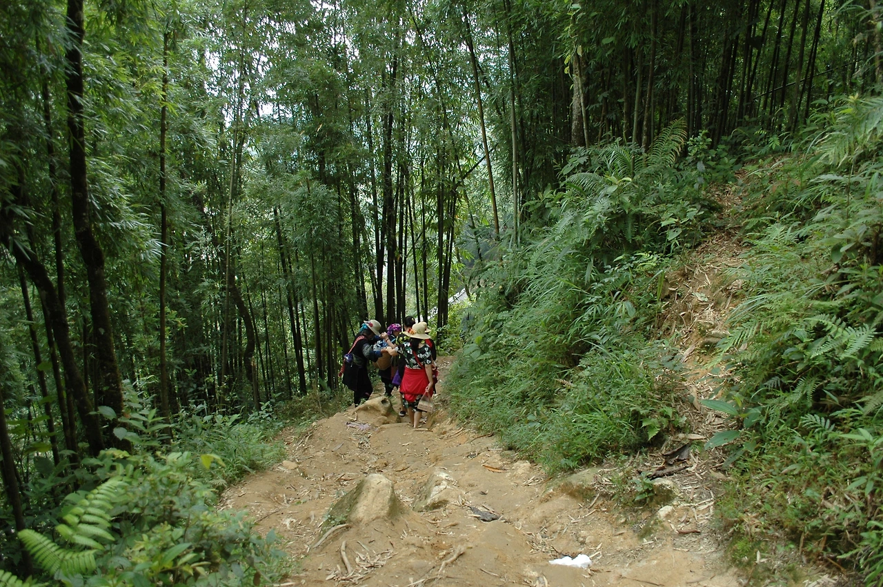 내려가다 보면 이길이 맞나 하는 의구심이 드나, 걱정 말고 좁은 길을 따라 내려가면 된다. 좁은 길을 잘 보면 사람이 많이 다닌 흔적을 볼 수 있으며, 이런 길들을 몽족 가이드가 트레킹족을 데리고 다니는 길이다. 이 길을 가다보면 빈집 같은 몽족 가옥들이 여러 나타나며, 대나무가 울창한 작은 계곡사이를 나 있는 것을 볼 수 있다. 대체로 낮은 경사길로 되어 있어 트레킹을 하는 것이 큰 무리는 아니었다. 또 길을 가다보면 길이 안보일 때가 있는데, 주로 가옥 근처에서 그런 현상이 나타나며, 두리번 거려보면 길이 보인다. (아래 사진 참조)