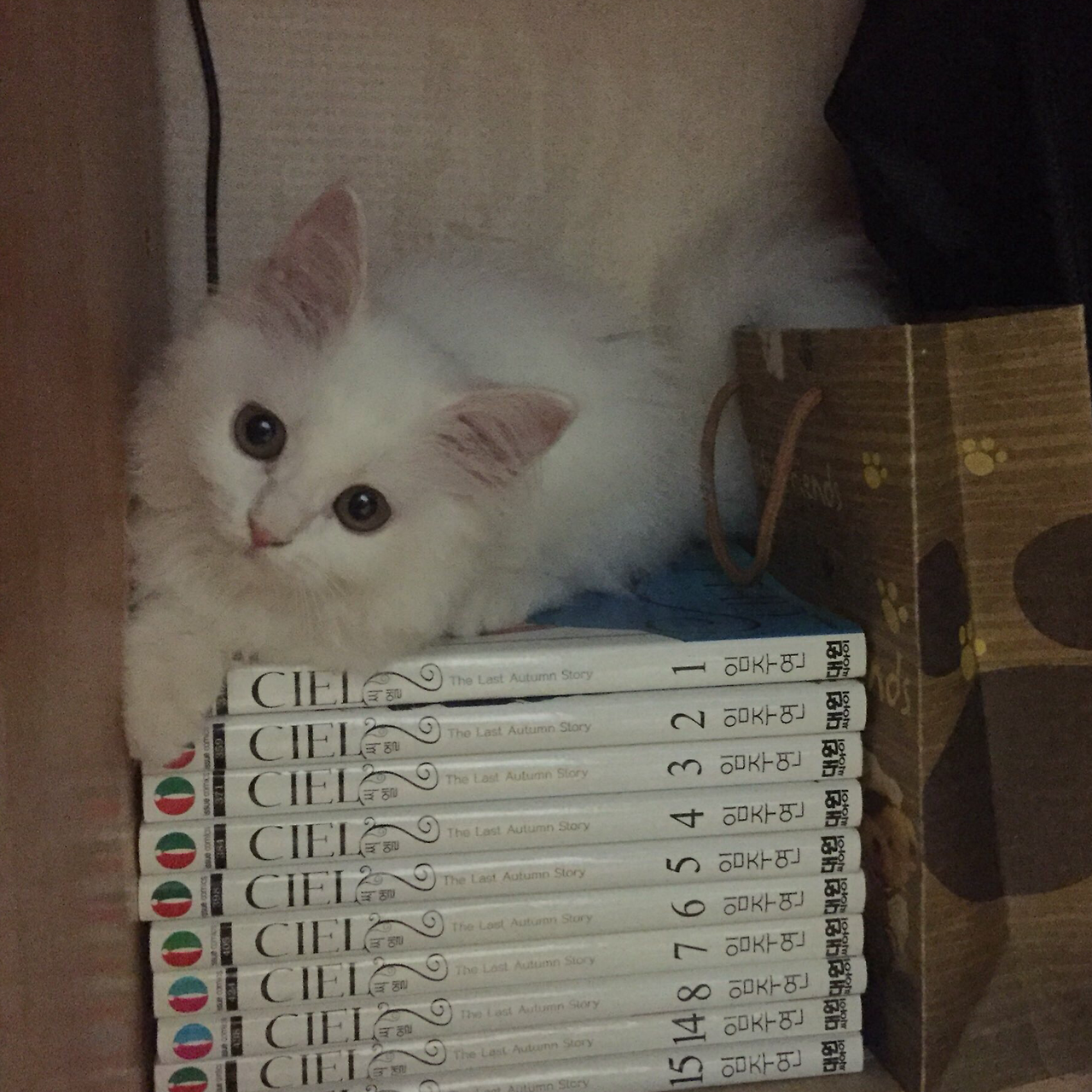 어둡고 숨을 수 있는 또 다른 공간으로는 집사가 모으는 만화책 위를 선호한다. 책상 아래인데다가 저 부분을 밟으면 의자 위로 뛸 수 있기 때문에 더더욱 좋아하는 듯 싶다.