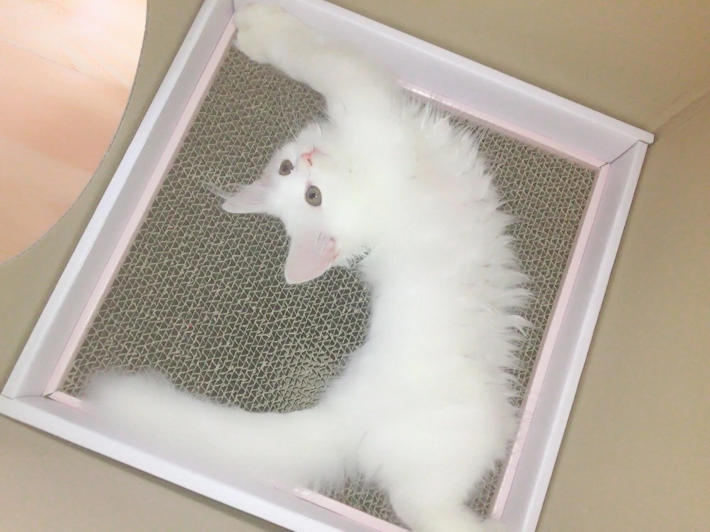 ...귀여웠다. 상품을 영업하려는 의도는 아니지만 우유곽 안에 들어가서 고개를 내밀고 있는 솜솜이를 보면 사진을 찍고 싶은 마음이 뭉클뭉클 샘솟았다. 솜솜이는 자신의 공간이 퍽 마음에 드는지 집이 생긴 첫날부터 그 안에서 잠을 잤다. 바닥에는 스크래쳐가 있어서 일어나자마자 바닥 긁는 소리가 들렸다.
