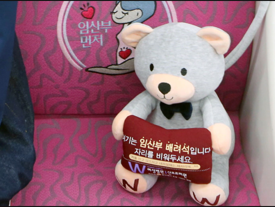 이러한 불미스러운 이유로 인해 결국 '임산부 배려석'이 따로 생겨났다. 물론 이 배려석 자체에도 문제가 많긴 하다. 임산부 배려석의 문구는 결국 이 배려석이 몸이 무겁고 힘든 임산부를 위해서가 아닌 아직 태어나지도 않은 '내일의 주인공'을 위해 있는 것처럼 느껴진다. (위의 사진처럼 "임산부를 위한 자리입니다"로 수정된 곳들도 있다.) 임산부=여성=분홍색이라는 사고 흐름도 지나치게 나이브하다. 대신 뭐, 강렬한 분홍색 덕분에 자리에 앉기 부담스럽게 만드는 효과는 있는 듯 싶다.