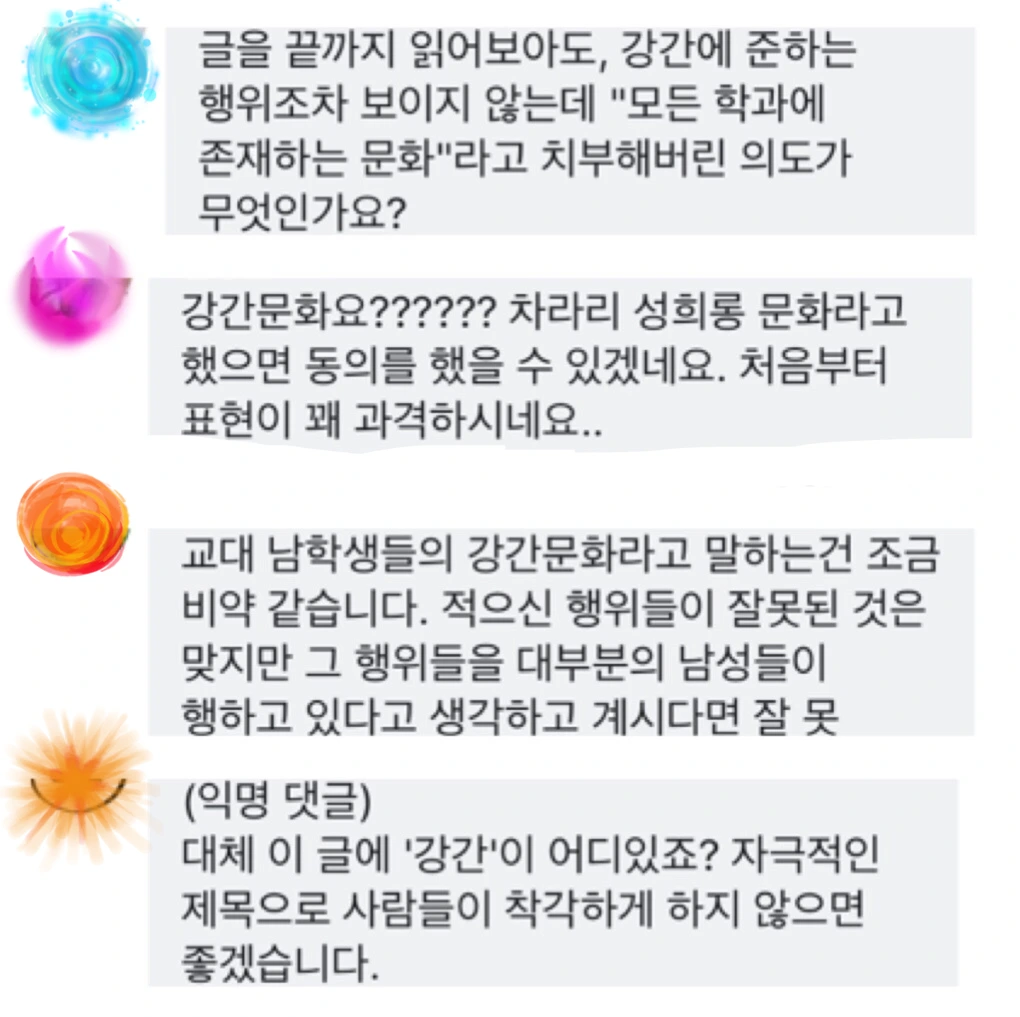 아이들을 가르치는 사람이 될 교대에서 이런 일이 일어났다는 것에 대해 많은 사람들이 탄식하고 있지만, 사실 중요한 건 교대가 아니다. 공학 대학 중에서 단톡방 성희롱 사건이 없었던 학교를 찾아보기 힘들고, 그 어떤 성범죄 기사를 가도 가해자를 옹호하고 피해자를 비난하는 댓글이 보인다. 강간문화는 어디에나 있다. 여성을 희롱하고, 평가하고, 등급을 매기고, 그것을 유머로 즐기는 것, 다시말해 그놈의 '남자들의 대화' 말이다.