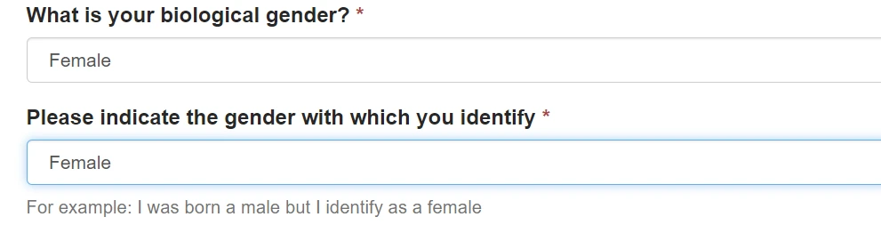 한국에서는 잘 보지 못했지만, '다양성'의 나라인 미국은 지원자의 생물학적 성과 내가 정의하는 성을 구분해 체크할 수 있도록 한다. 옵션에는 여성/남성뿐 아니라 'other'도 있다. 내가 선택하지 못한 것은 전자고, 내가 선택 가능한 것은 후자다.