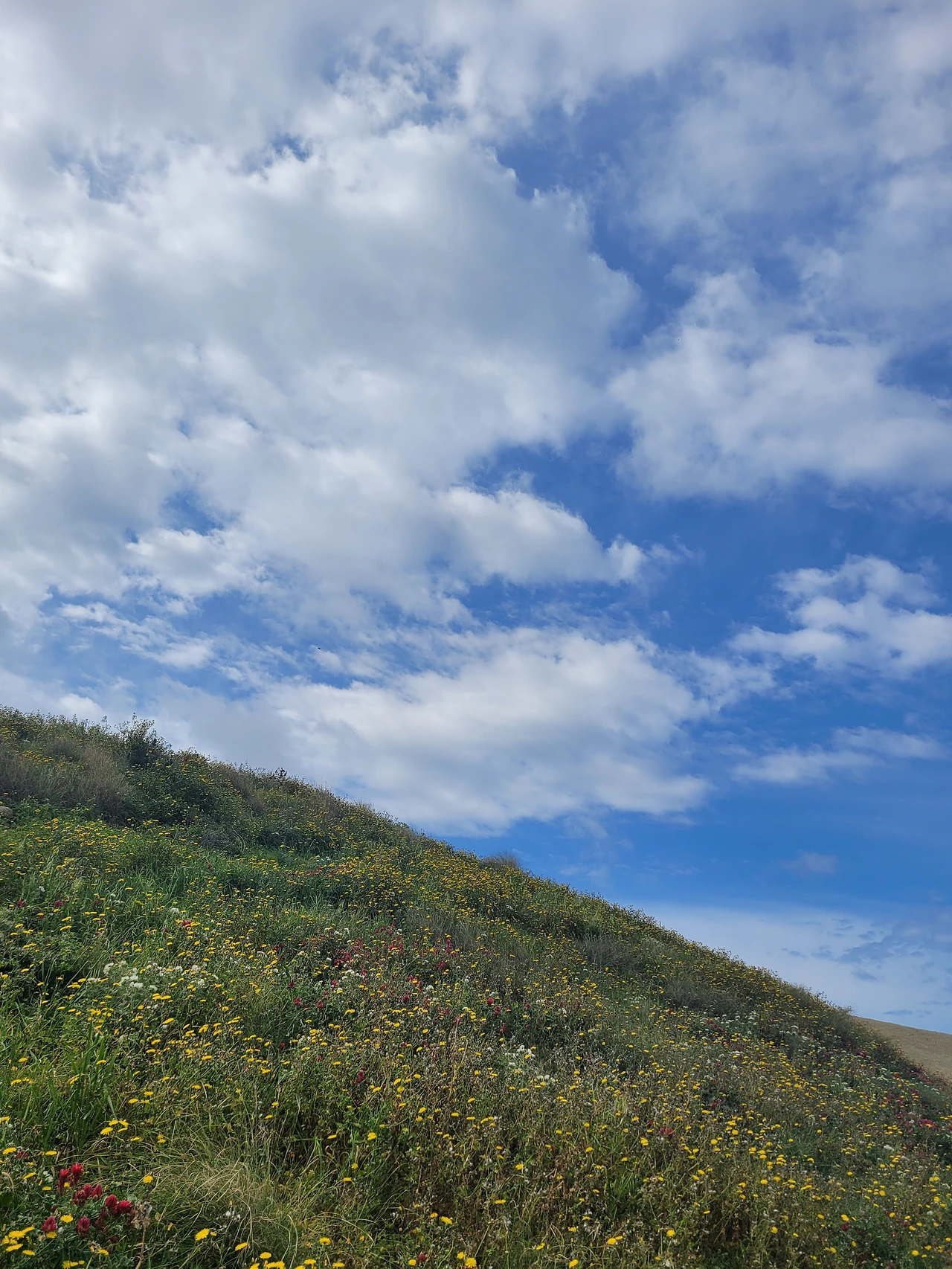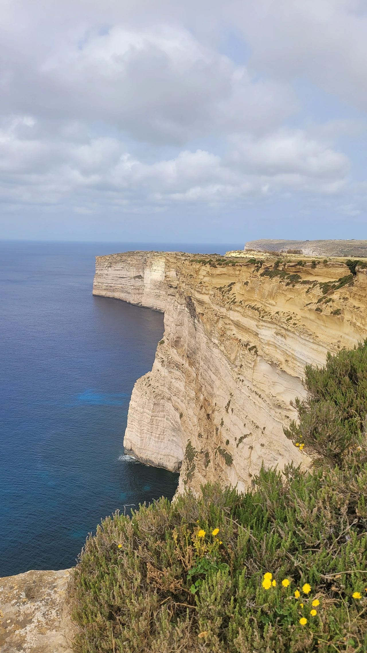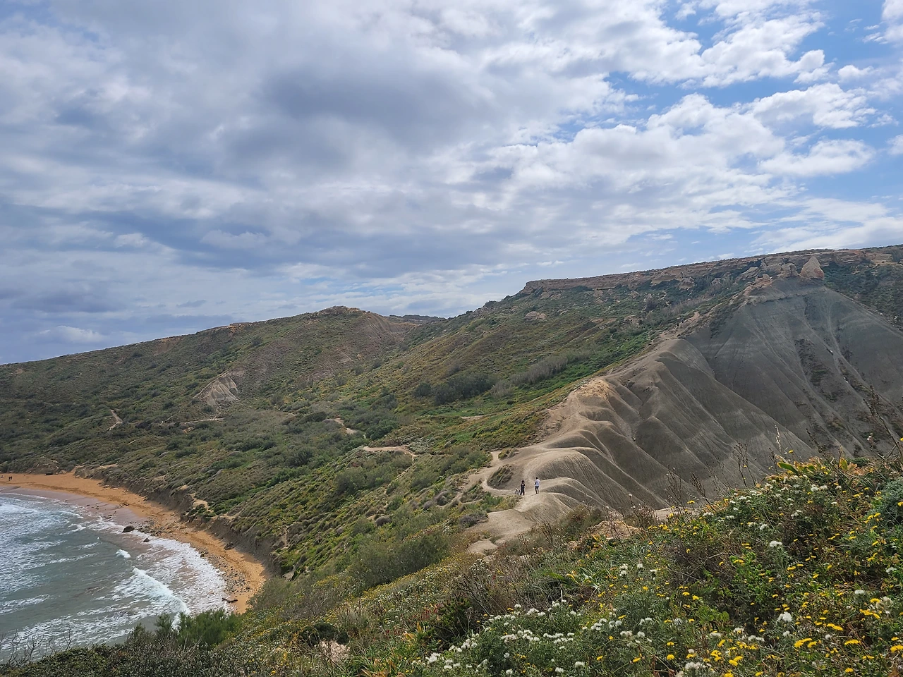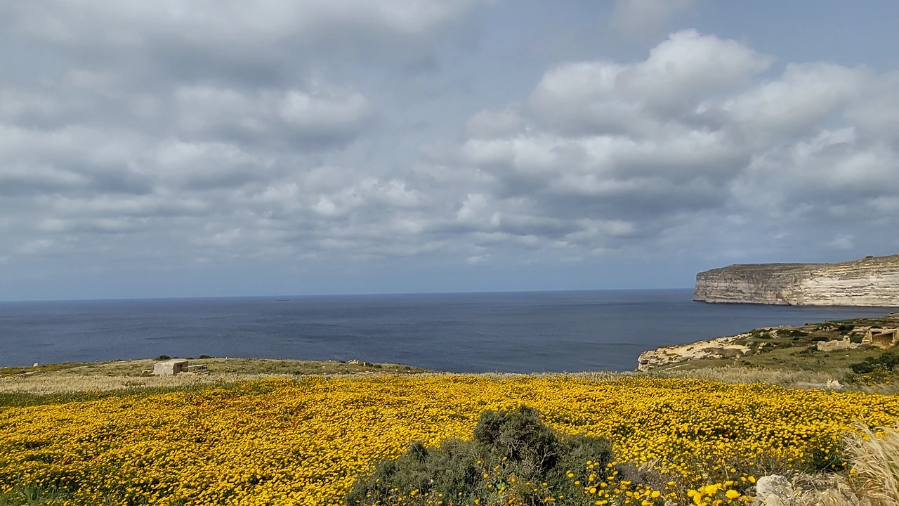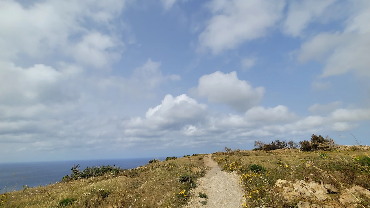 고조섬에도 하이킹 할 수 있는 데가 많다. 고조섬 여러 코스 중 난 가장 동쪽인 음자르에서 서쪽인 슬렌디까지 가는 코스를 추천받아서 여기를 갔다. 추천해준 사람의 추천평대로 정말 좋았다. 내 눈으로 직접 보고 있는 게 맞아? 싶은 그런 풍경이 끊임없이 펼쳐지는 길을 1시간 30분 동안 걸을 수 있다. 그리고 하이킹 코스가 막 잘 정비되고 그런 건 아니라 정말 그냥 자연에 있는 있는 그대로의 길을 걷는 느낌의 코스가 많다. 길 한쪽은 지중해 수평선이 보이는 깎아 지를듯한 절벽이고 다른한쪽은 꽃밭 아니면 풀이 무성한 길이다.