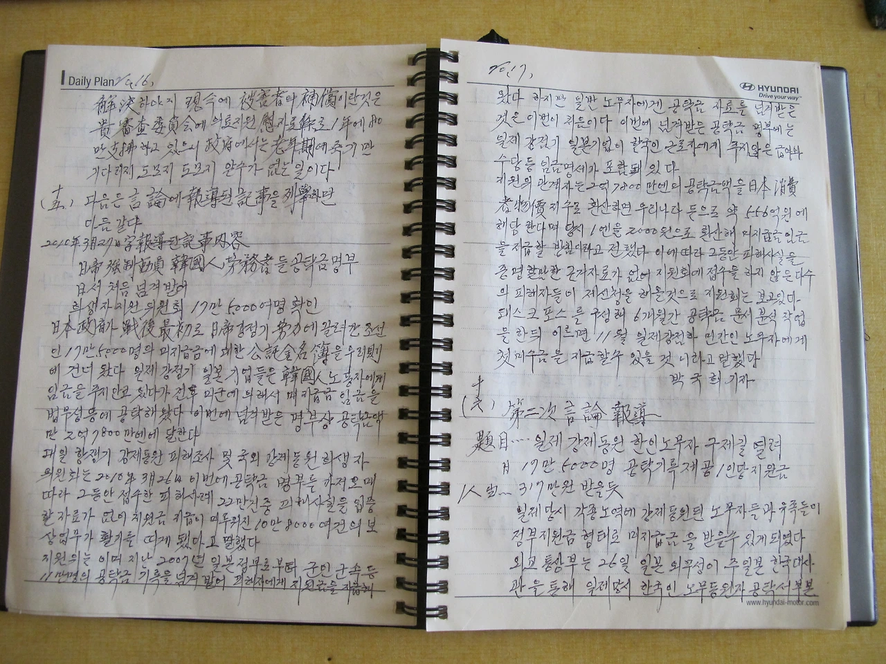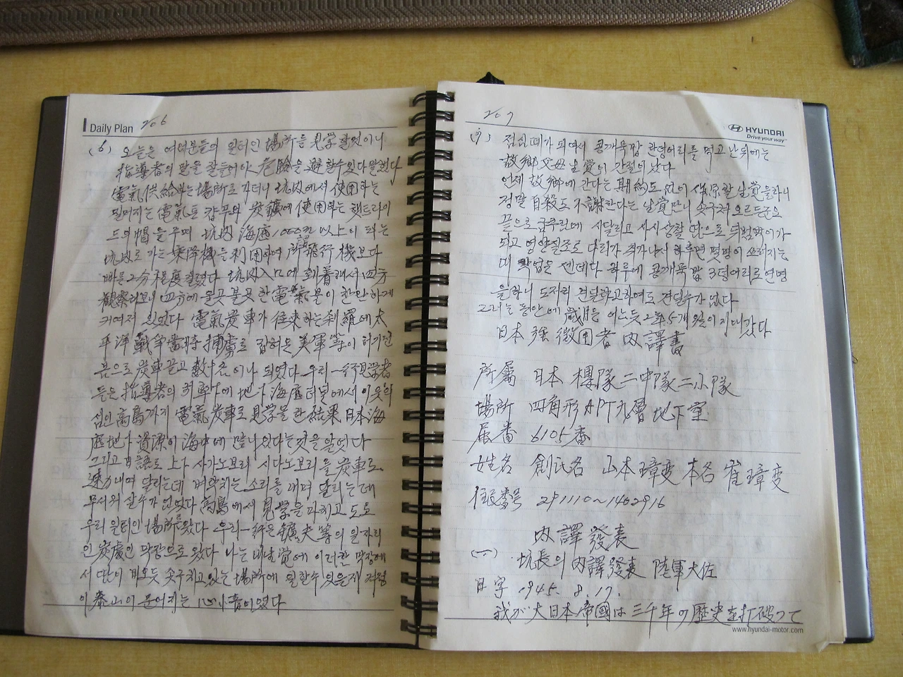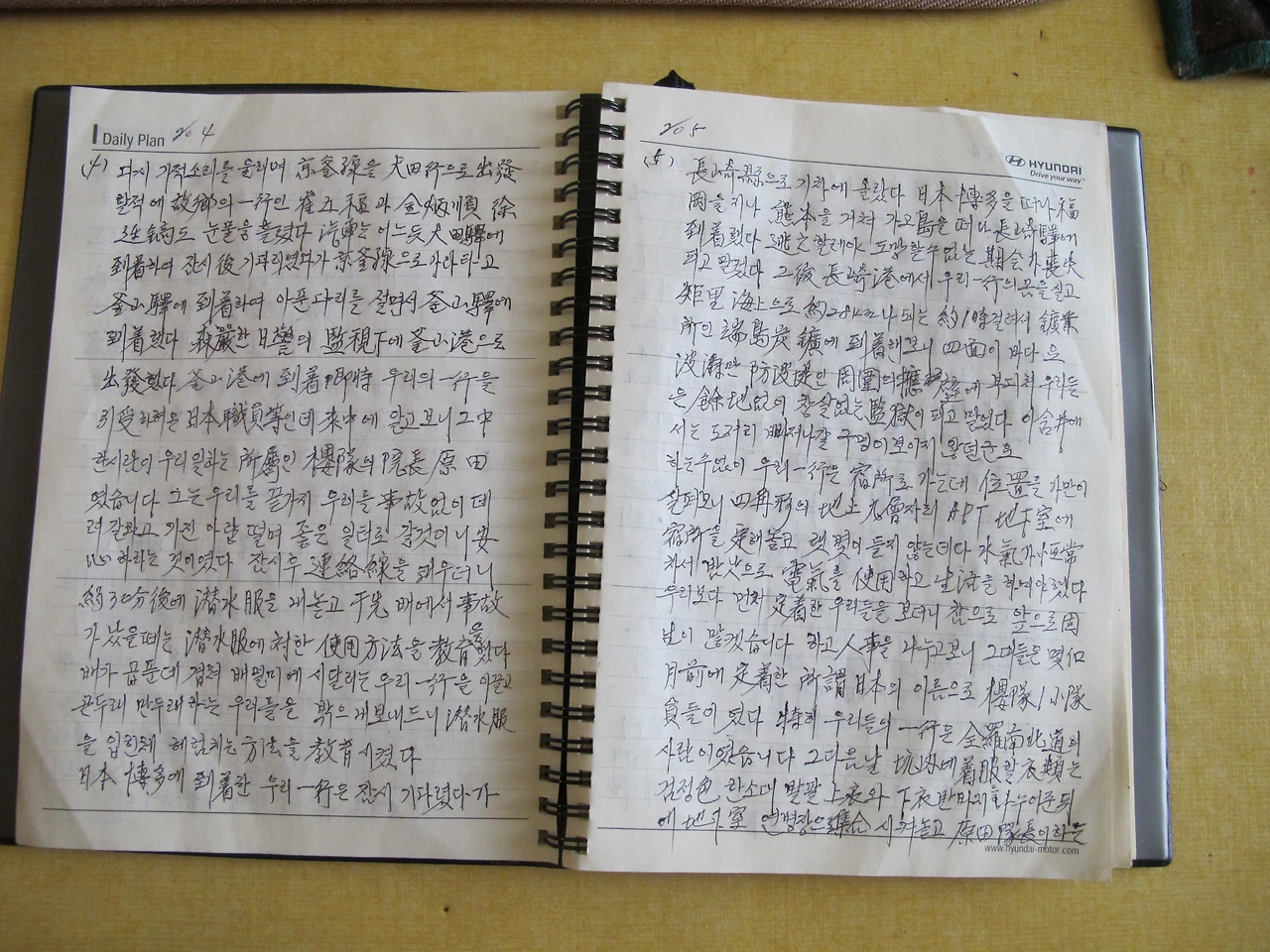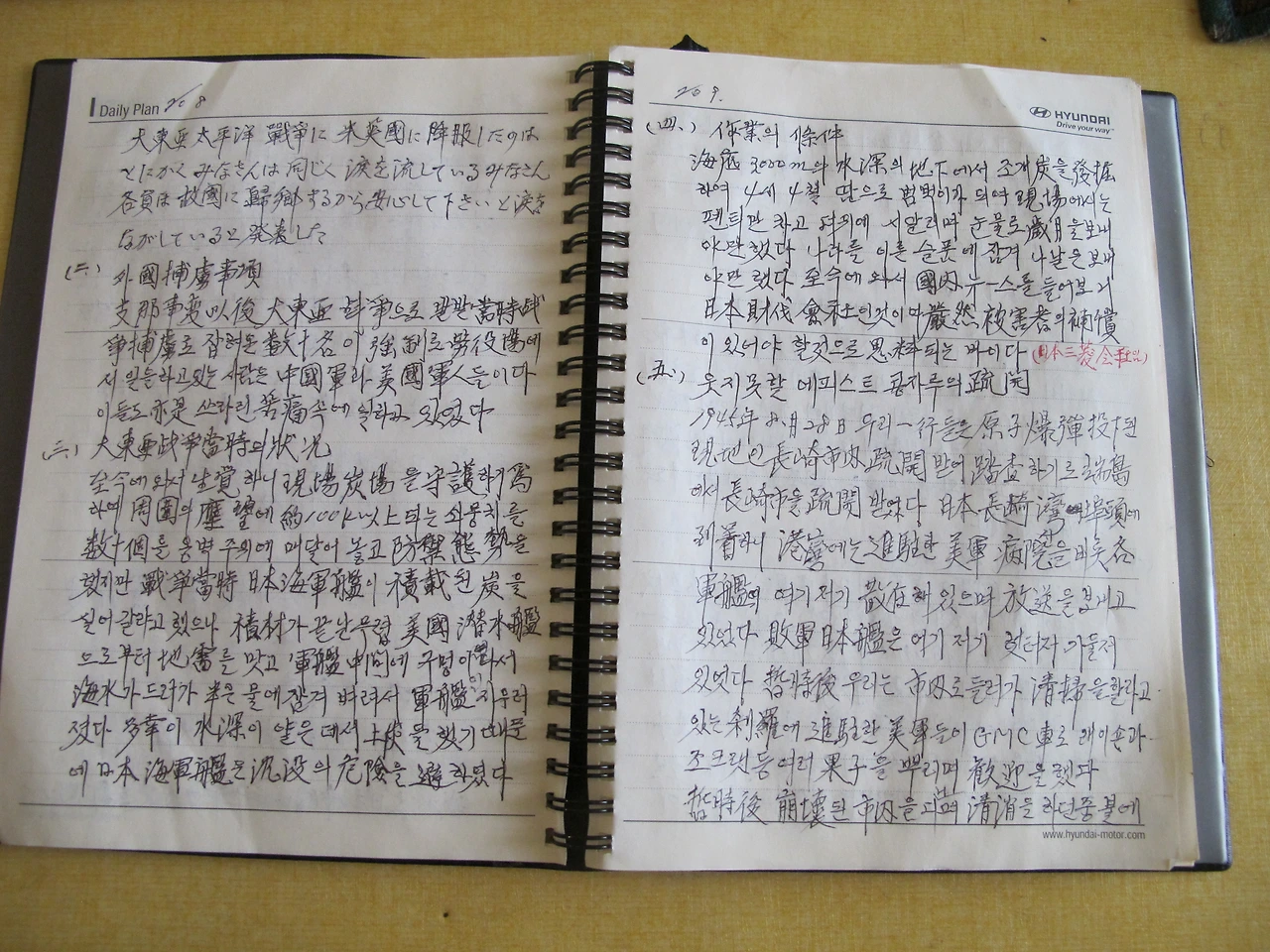 어르신께 재차 여쭙자 그러시더군요. "내 자서전을 보면 다 알 수 있어". 인터뷰에 동석한 어르신의 아드님이 자서전을 꺼내 주셨습니다. 할아버지는 자서전을 '신묘년(2011년으로 추정됩니다) 양력 5월 4일' 현대자동차 수첩에 적으셨더군요. 자서전은 총 22쪽으로, 군함도 이야기가 많이 나오는 것 같았습니다.