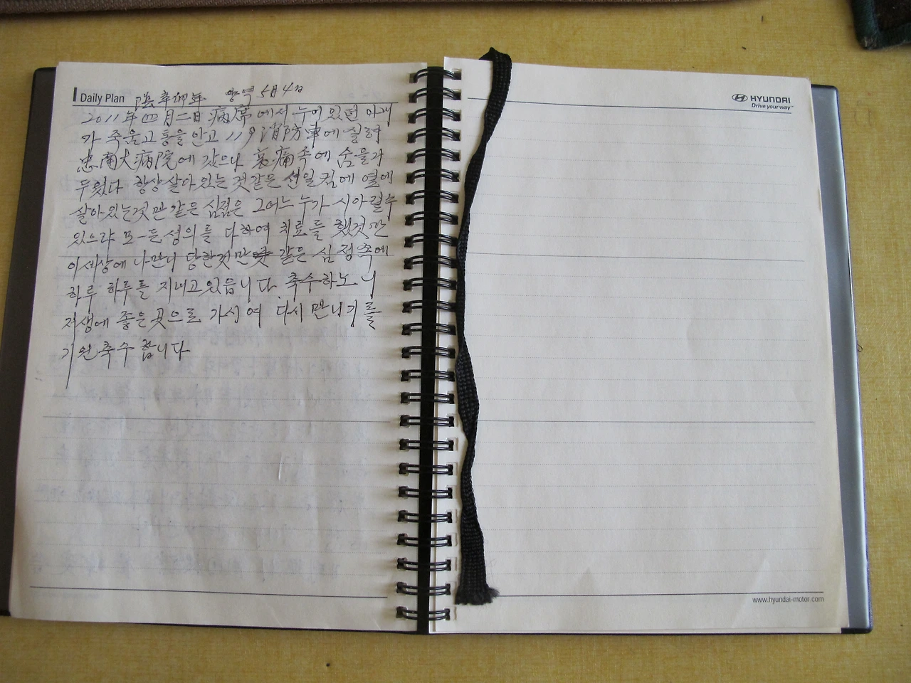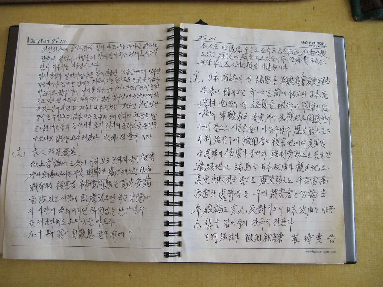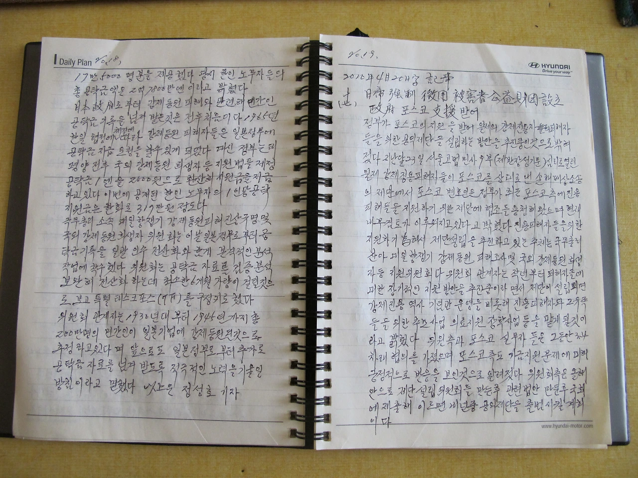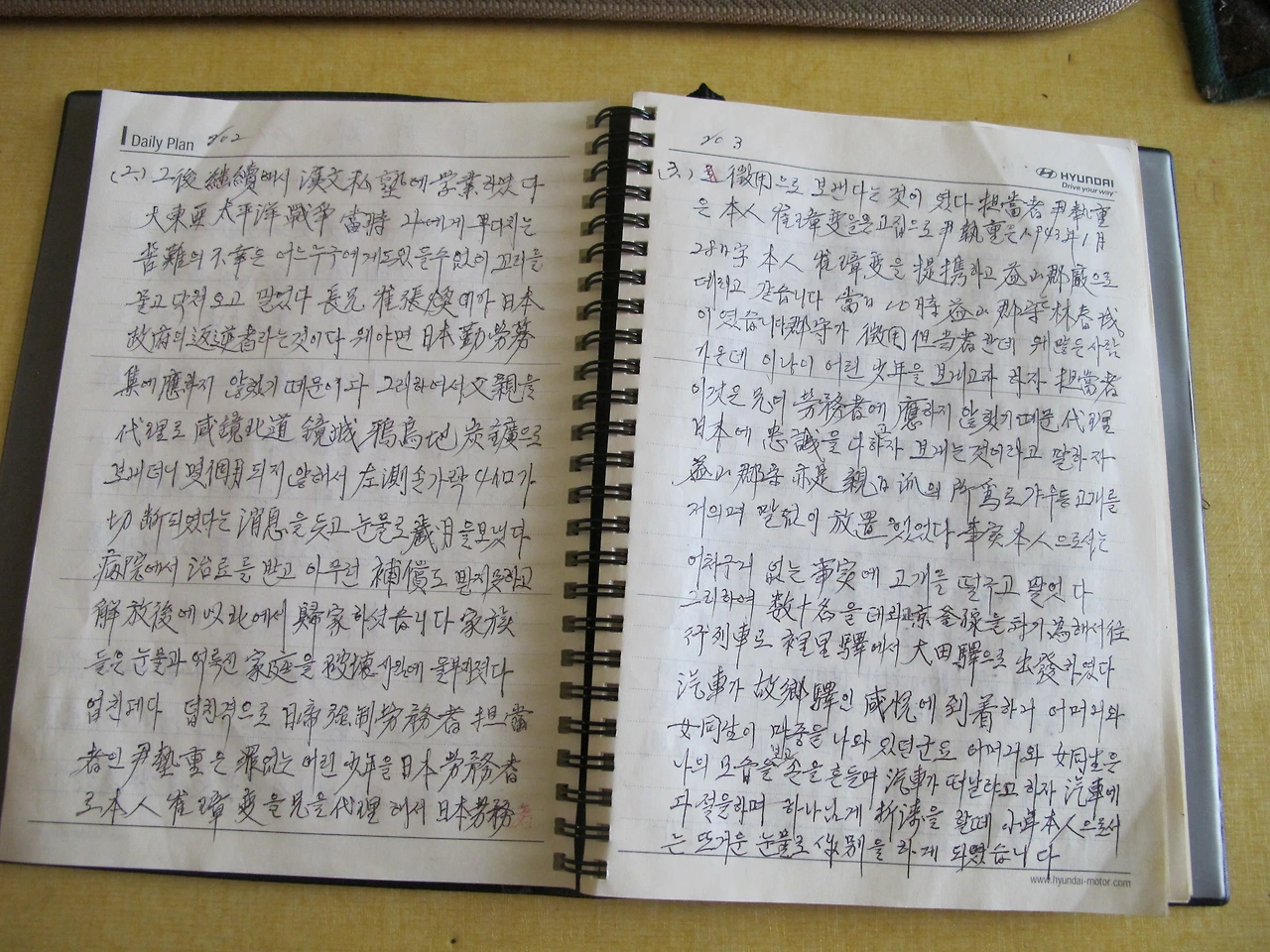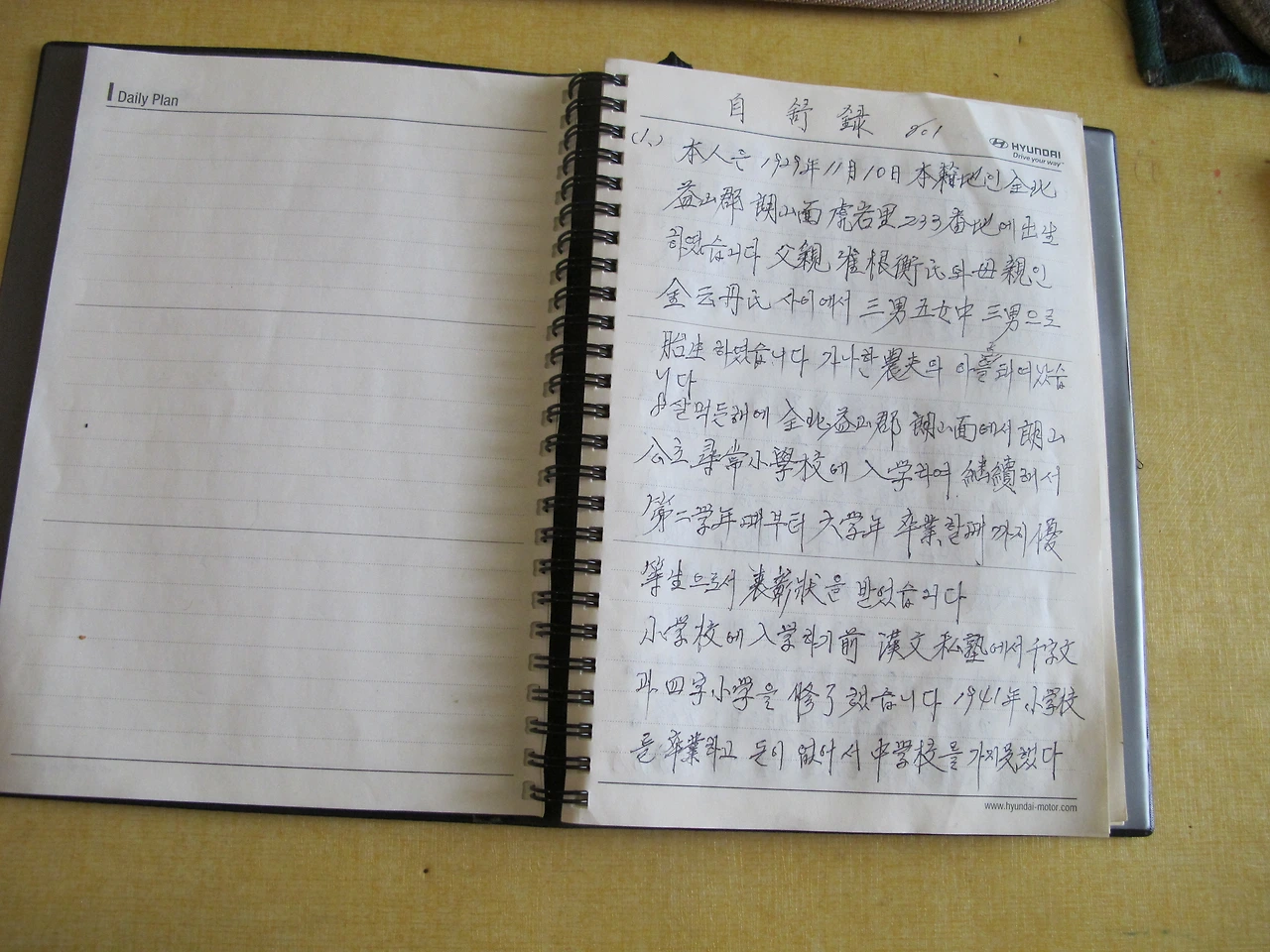 어르신께 재차 여쭙자 그러시더군요. "내 자서전을 보면 다 알 수 있어". 인터뷰에 동석한 어르신의 아드님이 자서전을 꺼내 주셨습니다. 할아버지는 자서전을 '신묘년(2011년으로 추정됩니다) 양력 5월 4일' 현대자동차 수첩에 적으셨더군요. 자서전은 총 22쪽으로, 군함도 이야기가 많이 나오는 것 같았습니다.