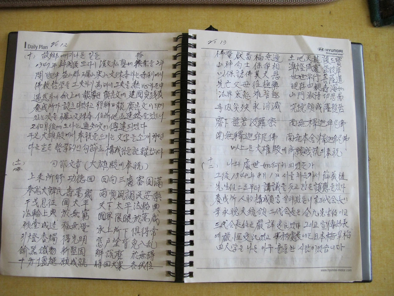 1947년 귀국 후 또다시 한문 사숙해 수업을 2년간 받던 중 익산군 여산 송산 문주사라는 사찰에서 불교철학을 공부하기 위해서 공부을(를) 열심 하던 중 우연하게 무슨 지상에 보도된 광고문에 건국실천원 양성소가 설립되였다고 조선일보 광고문이 되여 있는 것을 여산 문주사 주소지로 연락을 했더니 2개월 후에 오라는 통지문이 도착되였다(도착했다). 우선 대웅전에서 봉축을 드리는 문자를 소개하면 다음과 같은 철학적인 구절로 구성됨을 기록합니다.