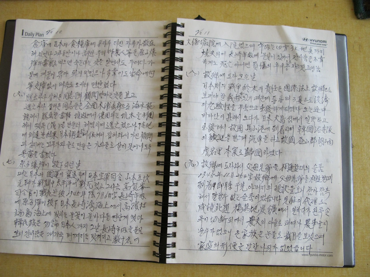 1945년 11월 25일 고향에 부모형제를 상봉할 때 도착 즉시 우선 아버지의 현상을 보니 참아(차마) 참혹해서 말할 수 없는 슬품이였습니다. 형제의 대리로 함경북도 아오지탄광에서 일하다가 왼쪽 손목이 절단되여서 농부의 아들로 태여나(태어나) 농사을(를) 지을 수가 없으니 온 가족은 눈물로 세월을 보냈으며 가정의 형편은 말할 나위가 없었습니다.