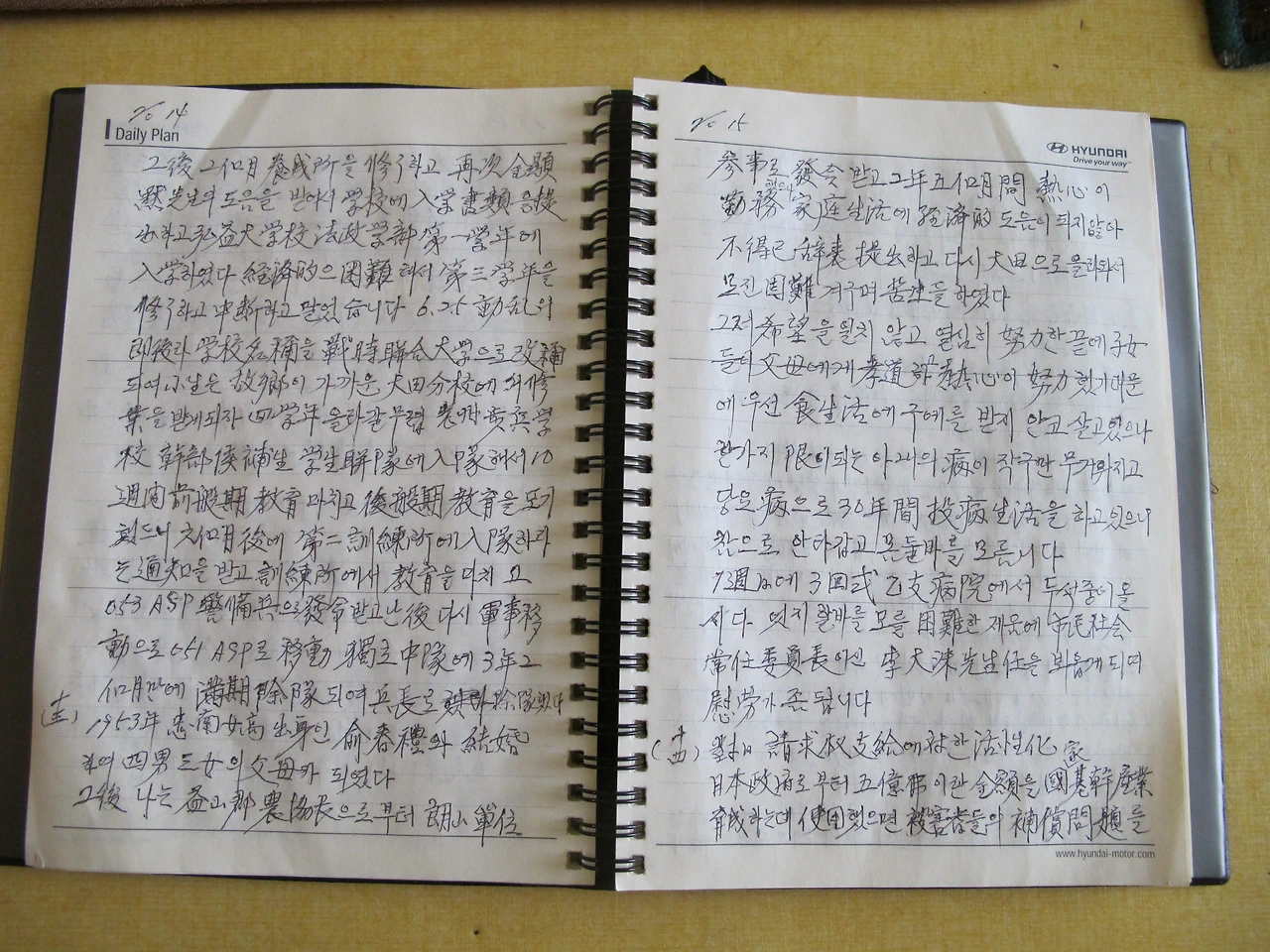 참사로 발령받고 2년 5개월간 열심히 근무했으나 가정 생활에 경제적 도움이 되지 않아 부득이 사표 제출하고 다시 대전으로 올라와서 모진 곤란 겨그며(겪으며) 고생을 하였다. 그저 희망을 일치(잃지) 않고 열심히 노력한 끝에 자녀들이 부모에게 효도하고 열심이 협력 했기 때문에 우선 식생활의 구에(구애)를 받지 안코(않고) 살고 있으나 한가지 한이 되는 아내의 병이 작구만 무거워지고 당뇨병으로 30년간 투병생활을 하고 있으니 참으로 안타깝고 몸둘 바를 모릅니다.