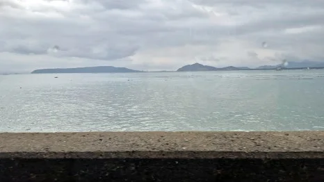 한적한 도로, 바다, 흐린 하늘.