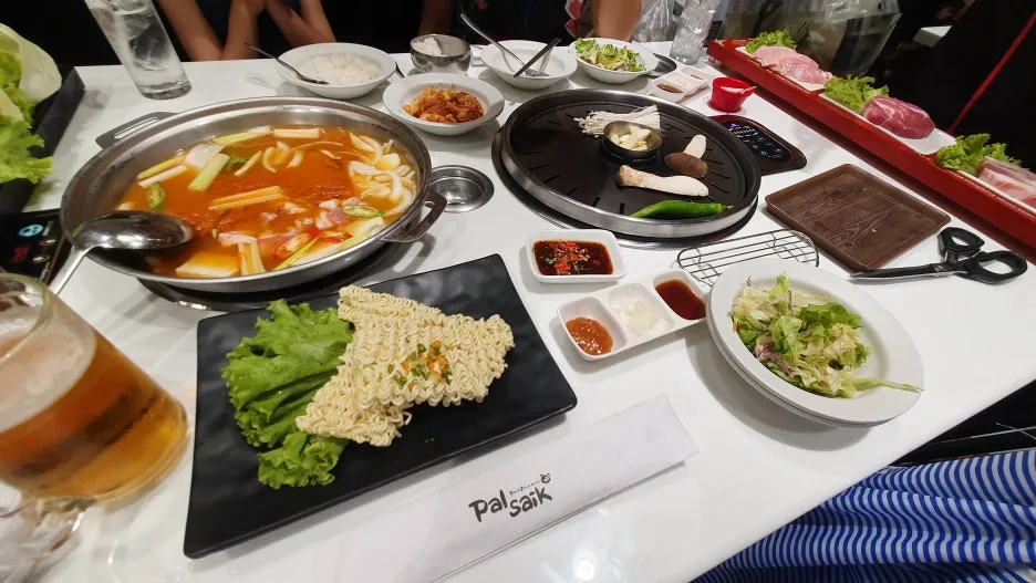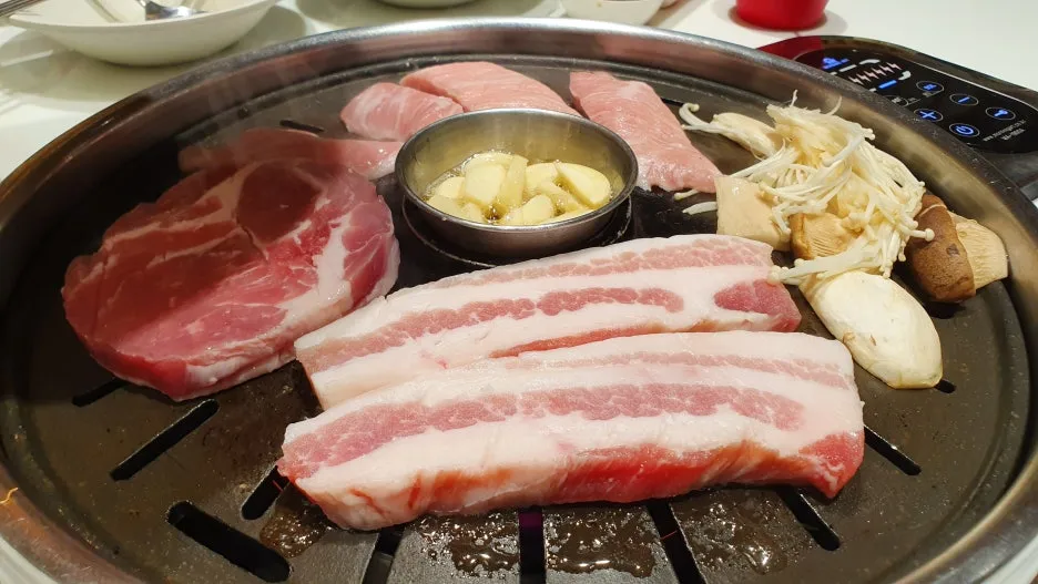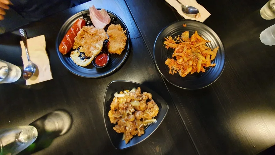 김치찌개가 끓는 냄비, 삼겹살이 지글거리는 소리,