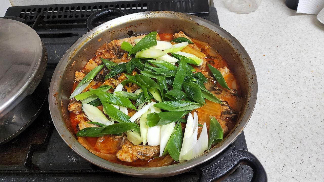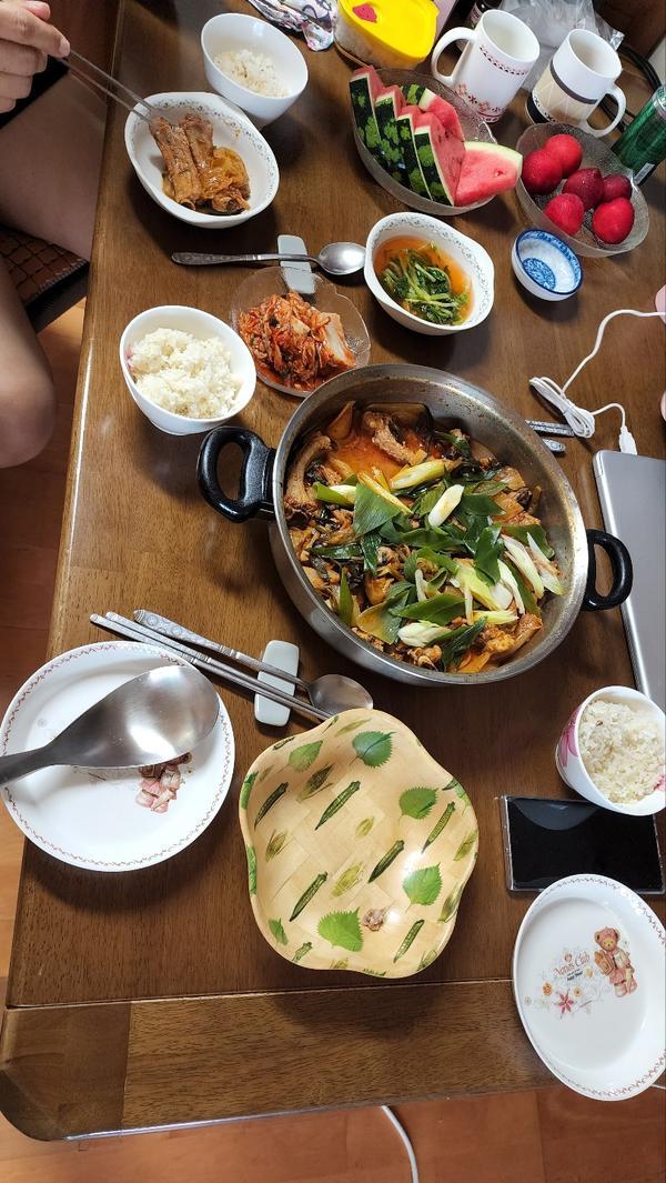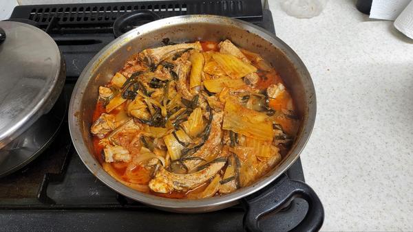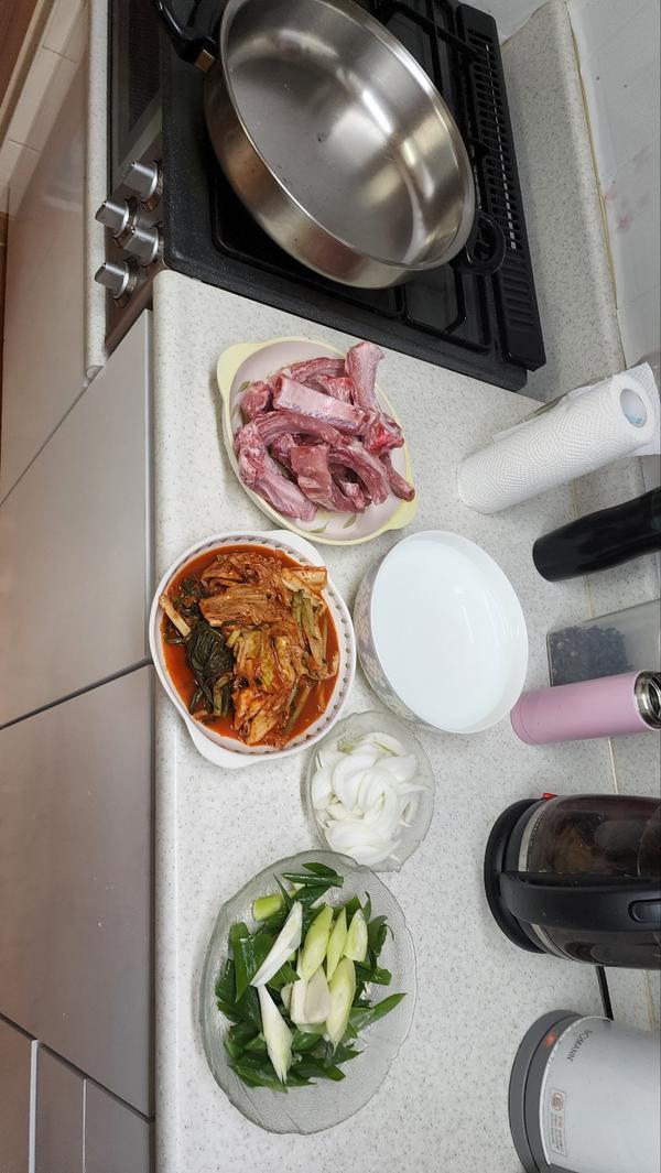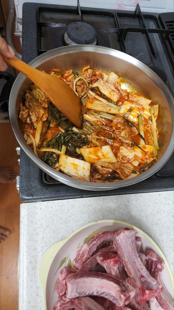 - 김치 먼저 5분 볶음, 갈비 5분 볶음, 고기 어느 정도 익으면(핏기 가시면) 물 넣기. 10분 센 불 30분 약한 불 1시간 정도 뚜껑 닫고 끓이기