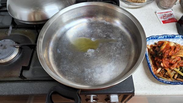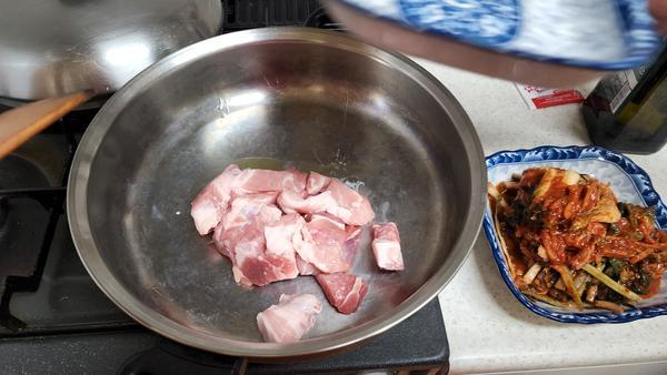 요리: 강불에 고기 먼저 살짝(3분) 익히고, 김치(3분), 양파(3분) 볶는데 냄비에 김치국물이 말라붙어 타면 잡내가 나므로, 불을 줄이고 탄 부분 없애기. 나온 국물을 졸인 뒤, 물 넣기, 강불에 700cc 정도 물 넣기(재료가 얼추 잠길 정도로) + 마지막에 대파 추가 가능, 10분마다 물 양 보고 중불로 줄이기