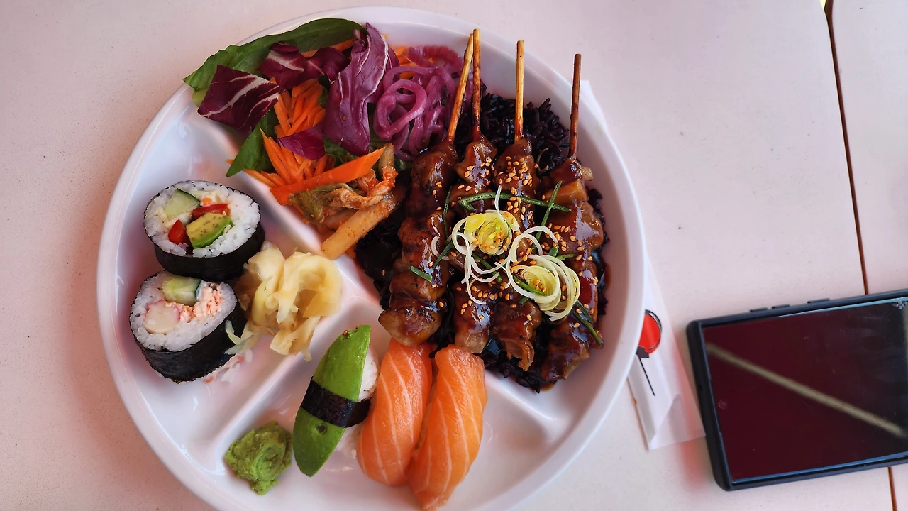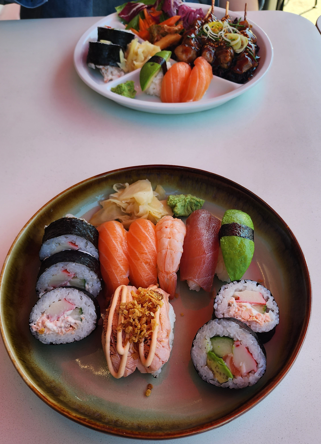 Lunch 메뉴 주문 - 중간 스시 (12개) 120 kr (약 만오천 원), 야끼토리 & 스시 (5개) 130kr (약 만육천 원)