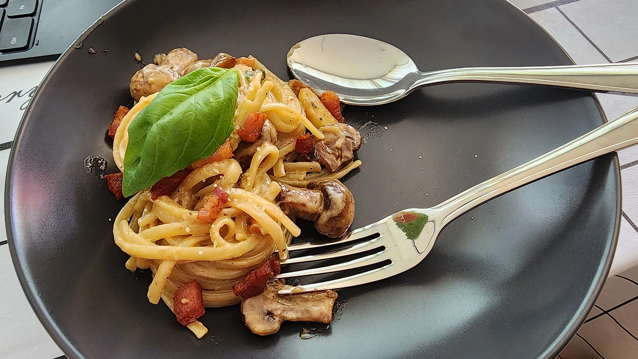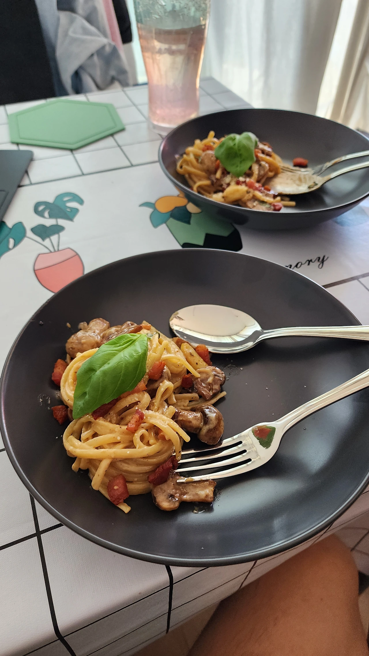 짭짤한 버섯과 베이컨과 신선한 바질로 향을 낸 까르보나라, 맛있었다.