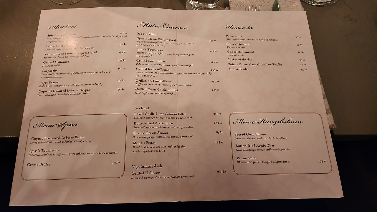 Kungsholmen에 위치한 음식점으로 가격대가 좀 있지만 괜찮은 분위기와 맛있는 음식을 즐길 수 있는 음식점이다. 회사 동료들과 부서 행사의 일환으로 방탈출을 즐긴 후, 저녁 회식을 위해 방문했다.