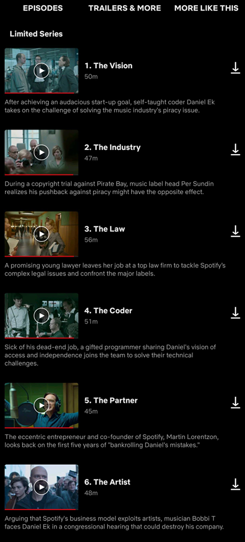 우선 구성이 깔끔하다. 6개 에피소드의 제목은 각각 The Vision, The Industry, The Law, The Coder, The Partner, The Artist이다. 각 화마다 특정 인물의 시점에서 스토리를 풀어나가는데 질질 끌지 않고 핵심 위주로 딱딱 풀어나가서 좋았다. 예를 들면 제목에서 예상할 수 있듯, 1화는 스포티파이 창업자의 시점에서 그 시작을 다룬다. 2화는 당시 음악 저작권 위반으로 논란이던 The Pirate Bay 와의 재판을 뮤직 레이블 대표의 입장에서 다룬다.