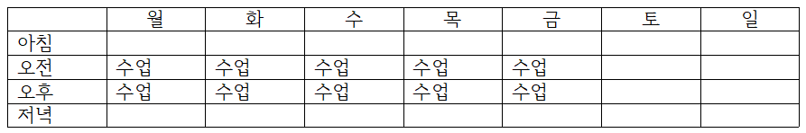 확보한 시간을 채우기 위해서는 우선 내가 해야 할 일들이 무엇인지 리스트를 짜보는 게 좋습니다. <수능 공부, 내신 공부, 학원, 수행 평가 준비, 진로 활동> 등등 할 일은 참 많습니다. 아래처럼 일주일 단위의 표를 만든 다음에 <수업> 외의 빈칸에 하나씩 집어넣어 봅니다.