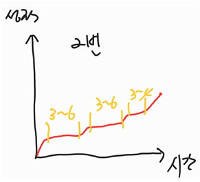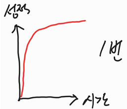 학습 기간과 성적의 변화를 그래프로 나타내면 모든 학생들이 단기간에 성적이 상승하여 꾸준히 유지되기를 바라는 마음에 모두 1번 그래프를 바랄 것입니다. 세상에는 정말 머리가 뛰어난 천재가 있고, 이 친구가 신나게 놀다가 마음먹고 공부하면 1번 그래프가 나올 수도 있을지 모릅니다. 하지만 99%의 친구들은 1번 그래프를 그리기는 현실적으로 꽤 어려울 겁니다. 그렇죠?