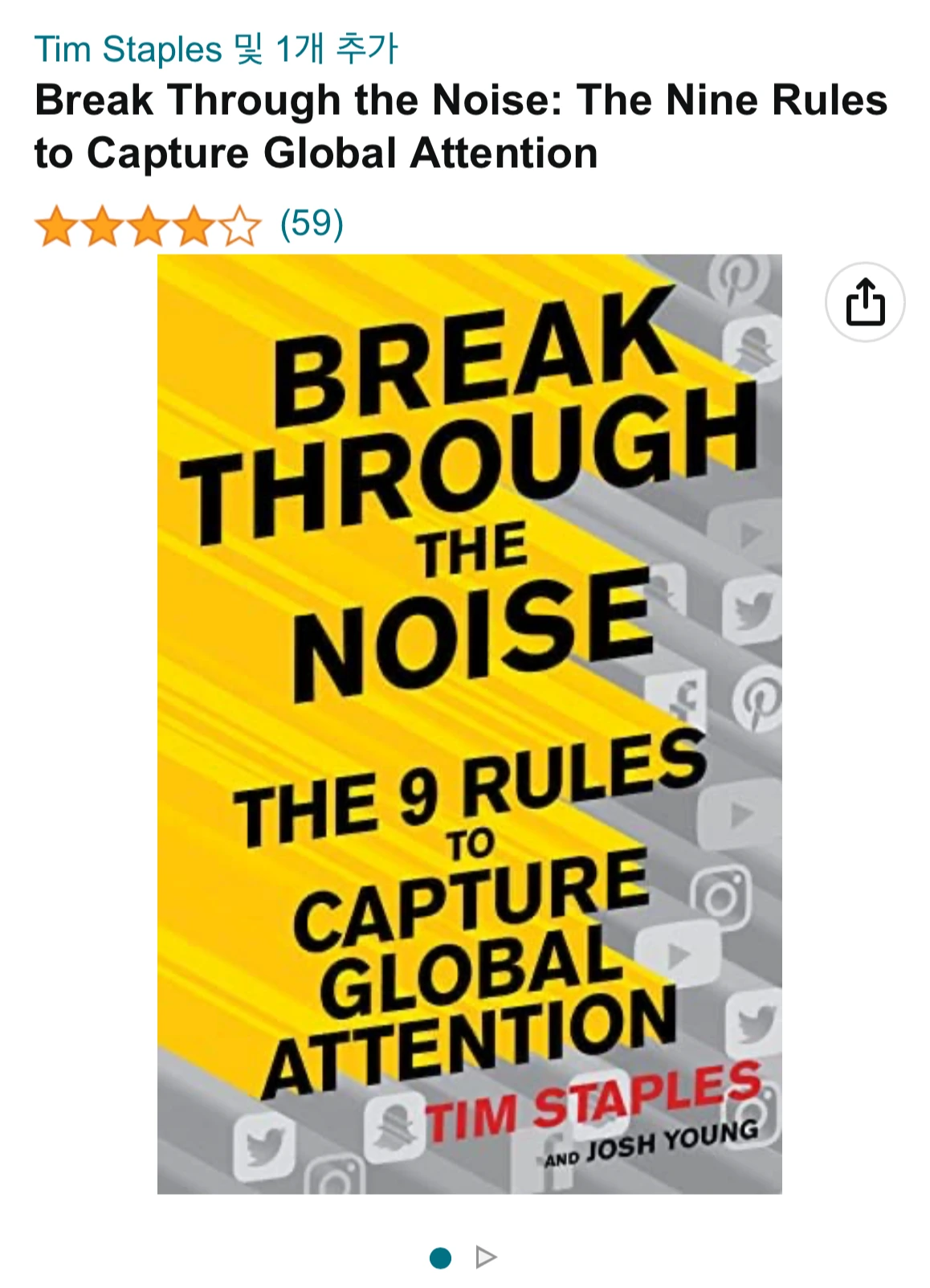 아마존 원서 제목은 노이즈를 통한 해결책(Breaking Through The Noise), 부제는 세계적인 주목을 끌 9가지 방법 < The Nine Rules to Capture Global Attention>으로 한국어 제목과 크게 다르지 않으나 조금 더 담백하다.