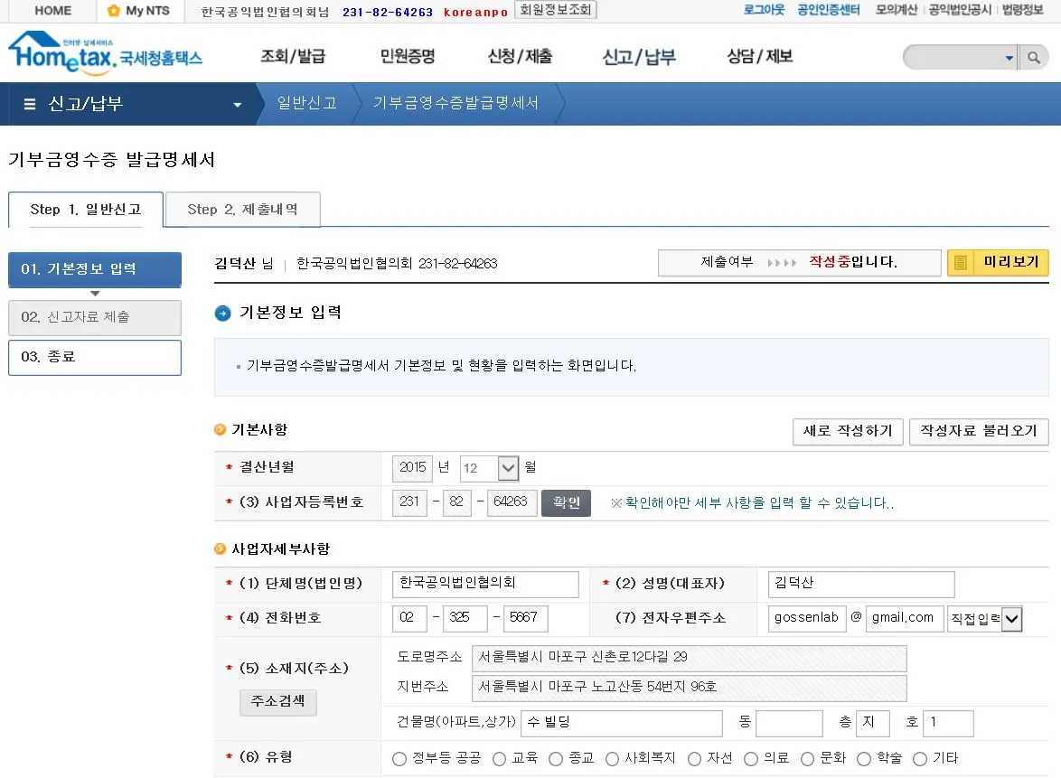 3. 기부금영수증 발급명세서 -> 기본정보 입력 -> 확인을 누르면 사업자 세부사항이 나타납니다.