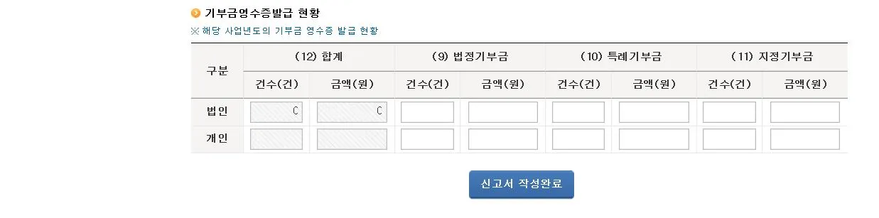 4. 기부금영수증을 발급한 사항에 대해서 법인과 개인을 구분하셔서 건수와 합계금액만 입력하시면 됩니다.