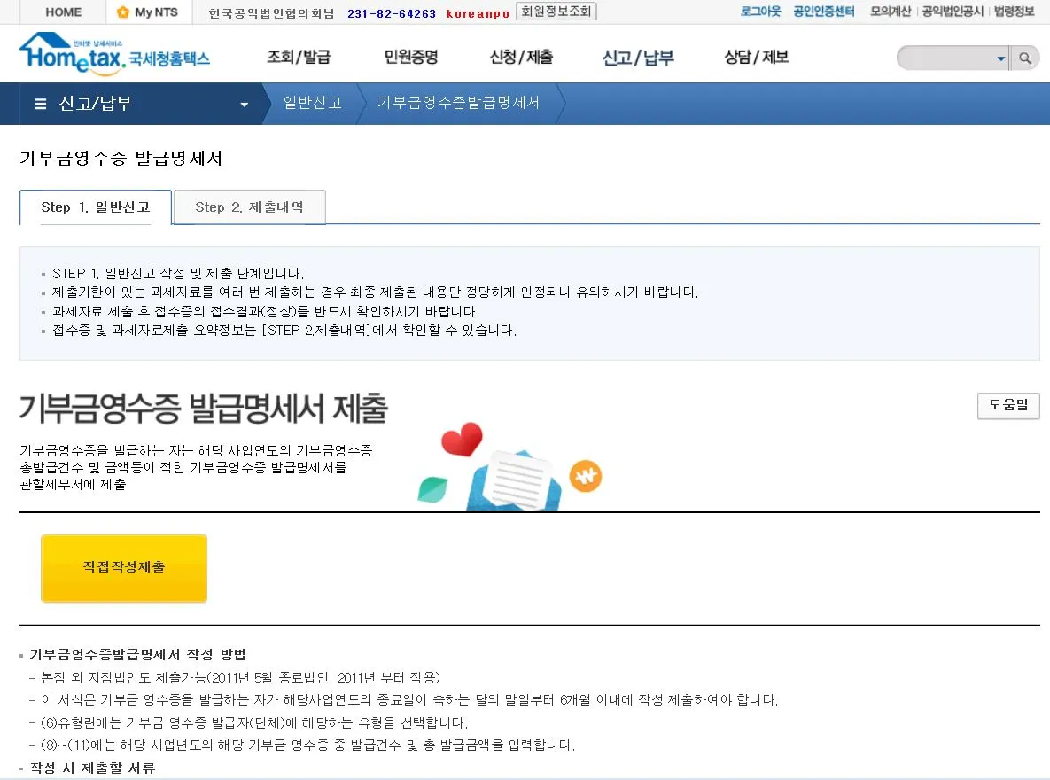 2. 기부금영수증 발급명세서 -> 직접작성제출 클릭
