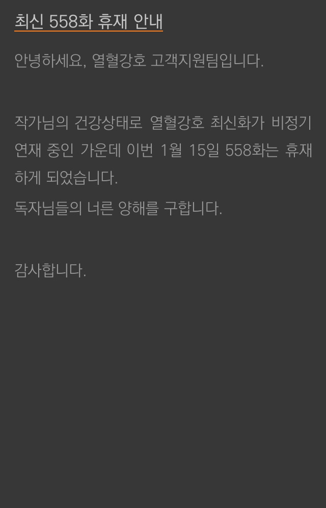 열혈강호 558화 휴재 안내작가님 건강이 많이 안 좋으신가 보네요. 목디스크라 작업하기 힘드실듯열혈강호 558화는 휴재입니다 낚시성 글에 속지 마세요. 예상 스토리한비광은 결국 동굴 안으로 다시 들어갈 수 밖에 없음. 도월천이 자하마신과 대치하는 동안 한비광이 후방을 노림. 무림인들과 동령 무사들이 하나둘씩 모이는 상황에서 동굴 앞에서 일전은 불가피 할 듯.