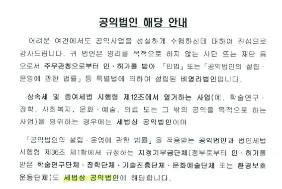 제 고객사 중에 두 군데서 위의 공문을 받았고 공익법인 해당 여부에 대해서 질의를 하였습니다.