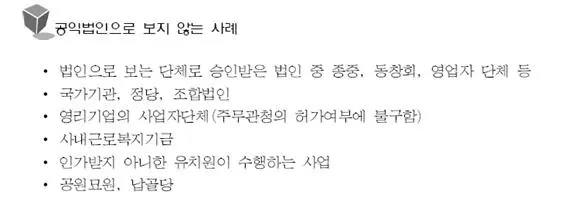 국세청에서는 공익법인으로 보지 않는 사례에 대해서 아래와 같이 규정하고 있습니다.