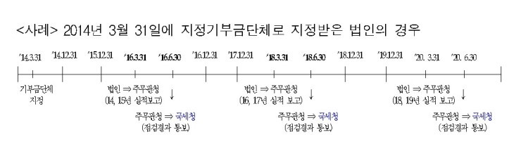 아래 사례의 경우 2014년도에 지정받은 지정기부금단체는 2019년 12월 31일까지 유지가 되며 2019년 종료 1개월전까지 지정신청을 하여야 합니다.