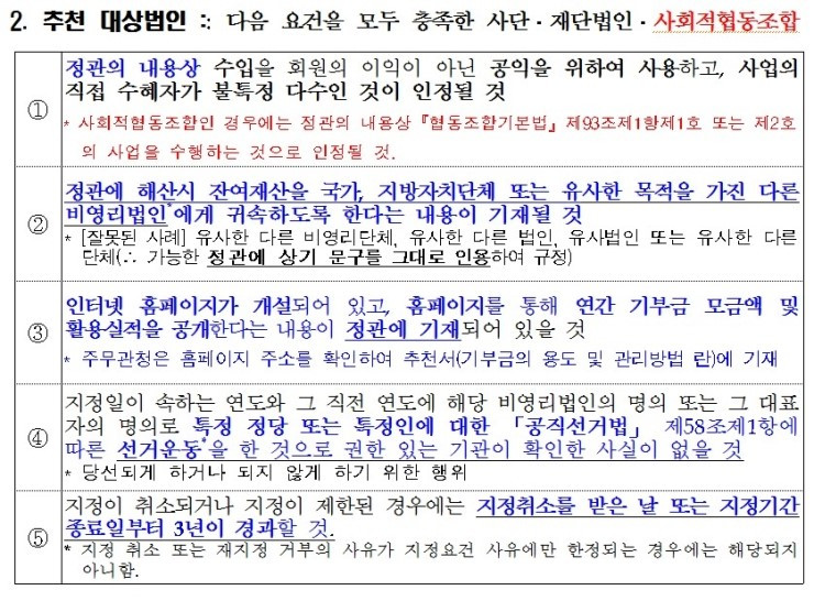 아래의 기획재정부 관련자료를 보시면 지정기부금단체의 요건에 대해서 열거하고 있습니다.