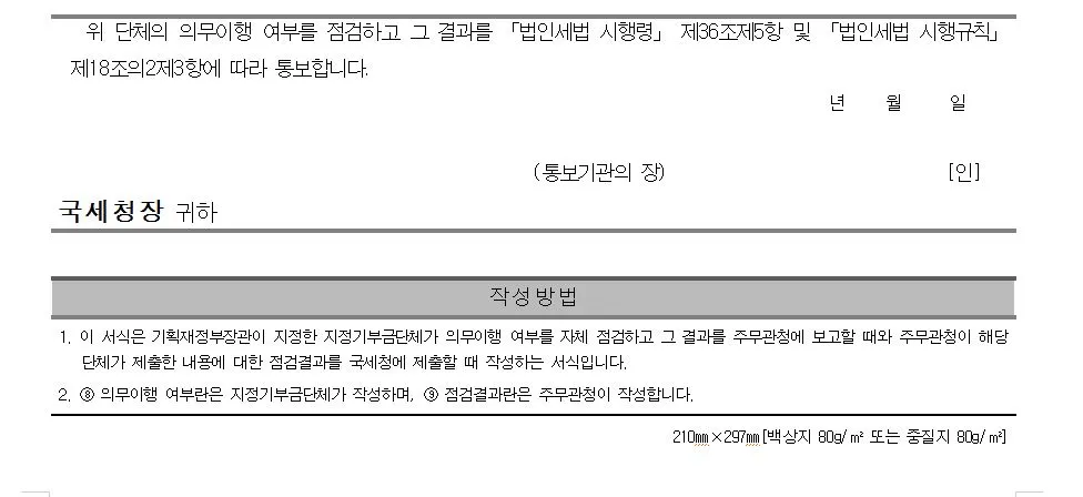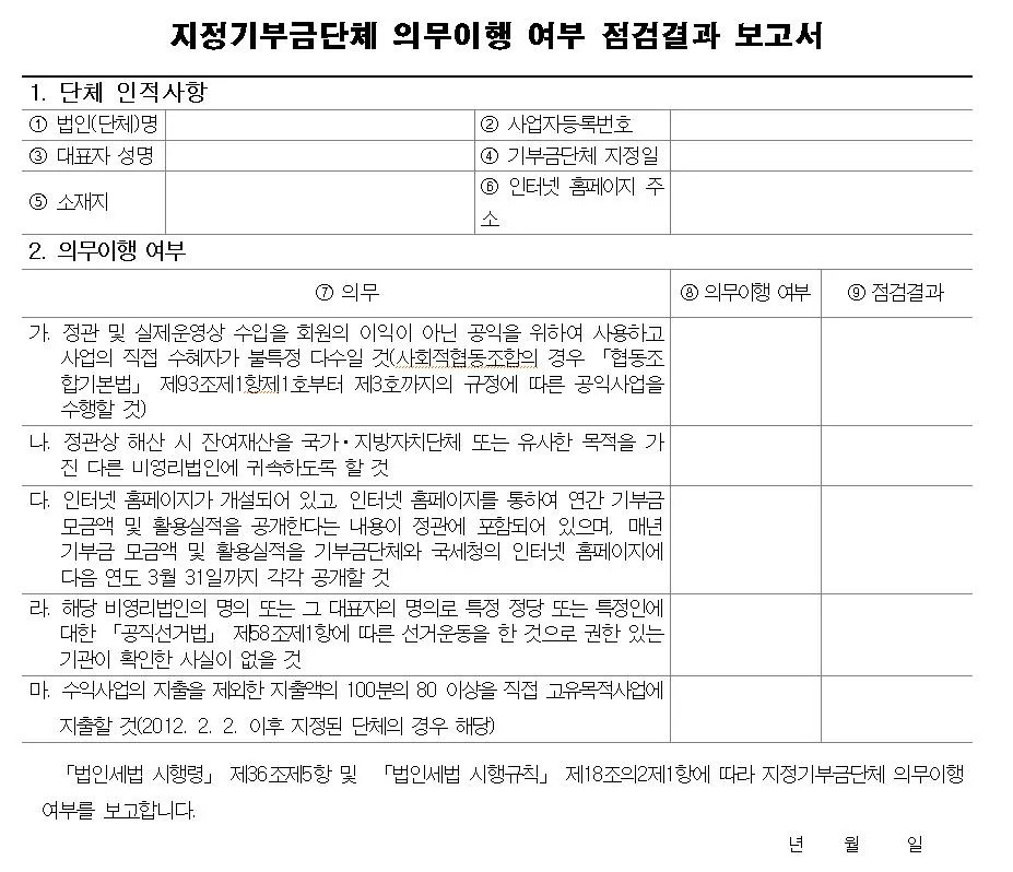 지정기부금단체로 지정받은 공익법인인 지정기부금단체 요건을 충족시키고 있는지에 대해 주무관청과 국세청에 2년에 1회 보고를 해야 합니다. 아래 서식을 주무관청에 제출하면 주무관청은 지정기부금단체 의무이행 여부를 검토후 국세청에 통보합니다.