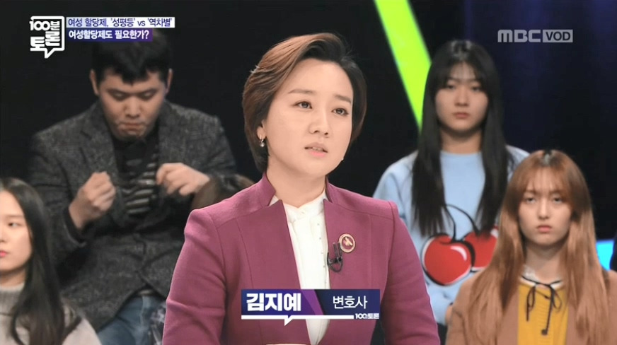 이날 방송 주제는 여성 할당제 도입이 성평등을 위한 방식이냐, 아니면 오히려 역차별이냐 아니냐였다. 김지예 변호사는 단순히 양적인 면을 고려해 여성의 사회적 비중을 늘리고, 진출을 장려하는 차원에서 할당제 도입이 무조건 필요하다고 했다. 대다수의 기업과 공공기관에서 상층부에 있는 여성의 비율이 적으니, 이 제도를 적극적으로 도입해, 여성의 사회적 진출을 보장하자는 논리를 폈다.