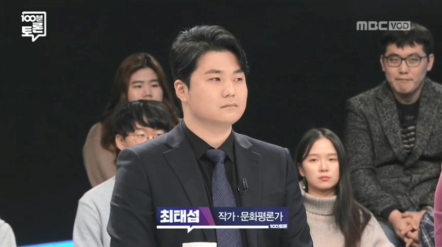 하지만 거기까지였다. 기대치가 높았을까. 그 이상, 그 이하도 아니었다. 이날 방송에서 존재감이 미비했다. 긴장한 기색이 역력한 가운데 토론 비중에서도, 자신의 주장을 내세우는 부분에서도 무색무취였다. 최태섭 문화평론가는 연구자로서 자신이 알고 있는 많은 논문과 수치, 통계, 현황에 대해 지나치게 의존한 나머지 자신이 주장하는 바와 의견을 적극적으로 개진하지 못했다. 심지어 방송에서는 이 자료를 찾느라 헤매는 모습을 보이기도 했다. 자신의 의견을 내세우면서 상대편 측의 논리적 문제와 결함을 꼬집었어야 했는데, 미흡했다. 이날 같이 출연한 세 명의 출연자들과 비교할 때, 더더욱 그러했다.