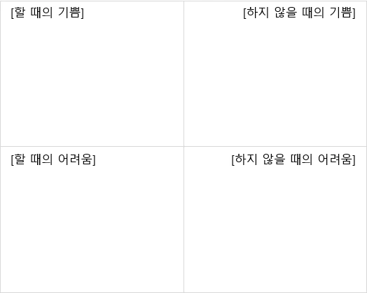 따라서 이때 필요한 것이 ‘포기할 것도 있지만, 개인이 얻을 수 있는 것에 대해 이야기해보는 것’입니다. 그냥 대화로 풀 수도 있고, 포스트-잇을 활용 해 포기할 것과 얻을 수 있는 것들을 적어서 벽에 붙인 후 이야기 나눠볼 수도 있습니다. 포스트-잇을 활용할 때 함께 사용할 유용한 도구로는 기쁨-어려움 차트가 있습니다. 고상무님의 사례에서는 변화 모임에 참석할 때의 기쁨과 어려움, 그리고 변화 모임에 참석하지 않을 때의 기쁨과 어려움 등을 포스트-잇에 적은 후, 4사분면에 붙이면서 함께 이야기해 보는 거죠