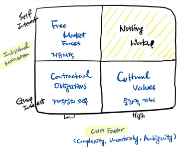 조직에서 예측가능성을 높이기 위해 이 4 사분면을 활용해서 관리하라는 것인데요, 재택근무 상황이라고 가정해서 설명해보겠습니다. 우선 ‘영역 ①’인, 자유시장 Free Market Forces 영역입니다. 이 영역은 CUA가 낮고(이것은 예측가능성이 높다는 뜻이겠죠) 개인적인 이득을 취해도 무방한 영역으로, 구성원 개인이 하고 싶은 대로 위임해주는 영역입니다. 재택근무 상황이라면, 카페든 집이든 어디서든지 일할 수 있도록 위임하는 것입니다. 어디서 일하는지, 일할 수 있는 환경인지 아닌지, 관리하지 말고 자율적으로 하도록 두라는 것이죠.