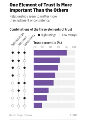 젠거와 포크만(Zenger & Folkman) 교수는 87,000 명의 리더에 대한 분석을 통하여 신뢰의 기반이 되는 세 가지 구성요소를 도출하였습니다. 좋은 판단 및 전문지식, 일관성, 관계가 그것입니다. 이 세 가지를 구현하는 것이 그렇게 말처럼 쉽지는 않지만, 내가 어떠한 상태인지, 무엇을 더 해야 신뢰도를 높일 수 있는지를 파악하기 위해 찬찬히 살펴봐야 합니다.