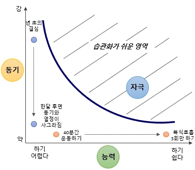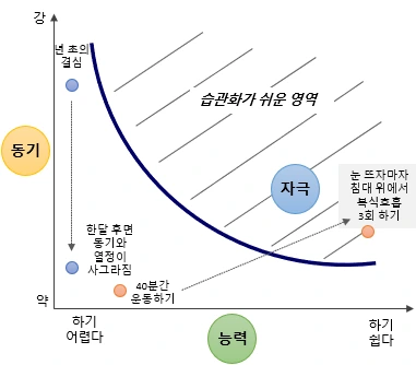 맞는 말 같습니다. 왼쪽 그림에 기록된 것처럼 동기는 변덕스럽습니다. 년 초에는 하늘의 별도 딸 것 같은 열정이 생기지만, 한 달만 지나면 이내 약해져 버립니다. 그래서 능력을 키워야 하는데, ‘40분간 운동하기’에 요구되는 능력은 너무 어려워서 실천하기 어렵습니다. 그래서 ‘복식호흡 3회 하기’로 난이도를 조정하는 겁니다.