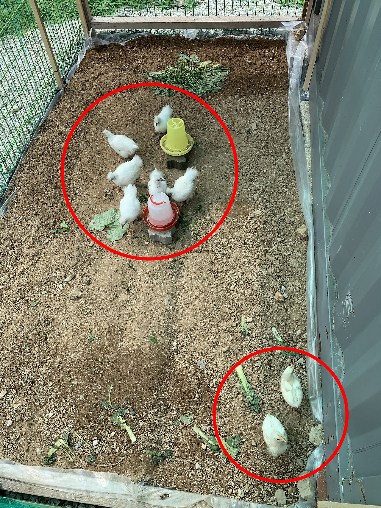 완성된 멋진 닭장에 병아리(어느덧 자라서 병아리와 닭의 중간인 듯)를 넣고 자유롭게 뛰어놀게 두었는데, 오늘 그 분이 오골계 병아리 몇 마리를 가져다 함께 집어 넣었습니다. 갑자기 낯선 얘들을 본 우리 병아리들이 머리수에도 밀리고 덩치에도 밀리다 보니, 한쪽 구석에 하루 종일 몰려 있더군요.